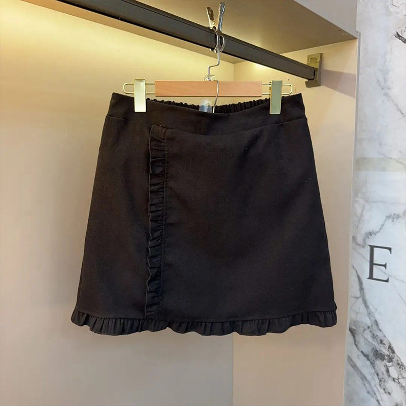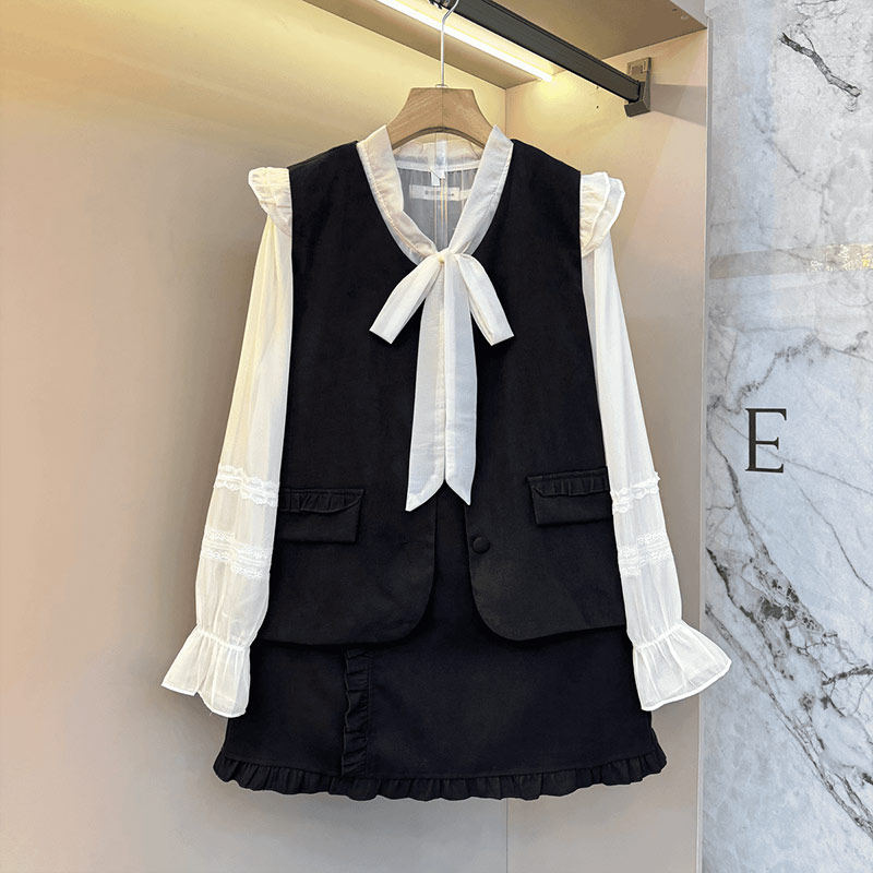加大码女装V领马甲荷叶肩长袖打底衬衫短裙胖妹妹气质显瘦三件套