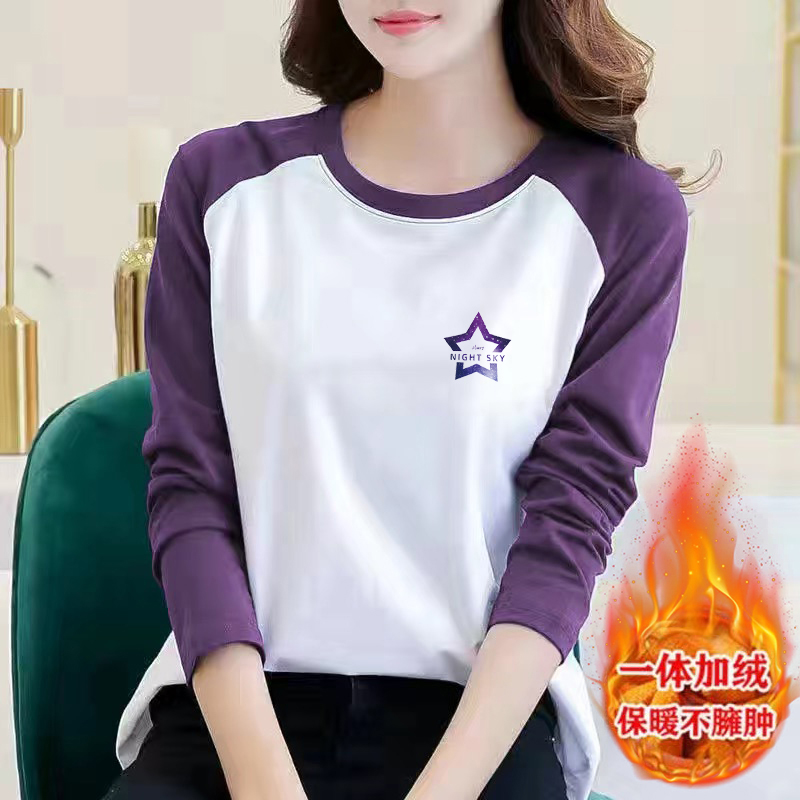 冬季品质双面德绒上衣女圆领长袖加绒打底衫拼色插肩加厚印花T恤