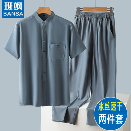 夏季短袖衬衣休闲套装冰丝衬衫中国风中老年男人爸爸爷爷装两件套