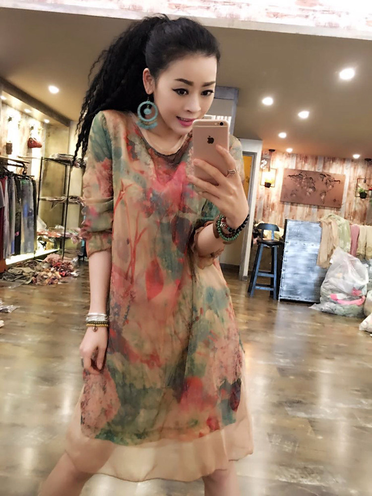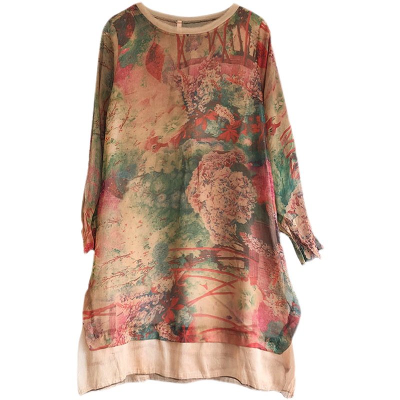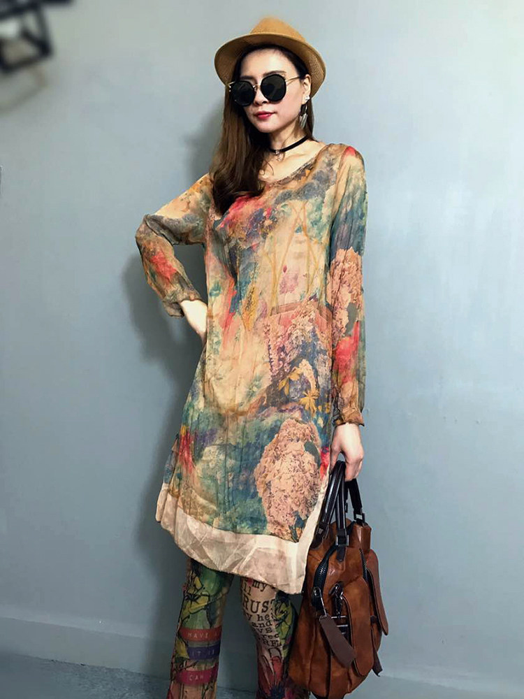 民族风印花女士衬衣长袖显瘦春秋圆领时尚碎花雪纺衫中长款不规则