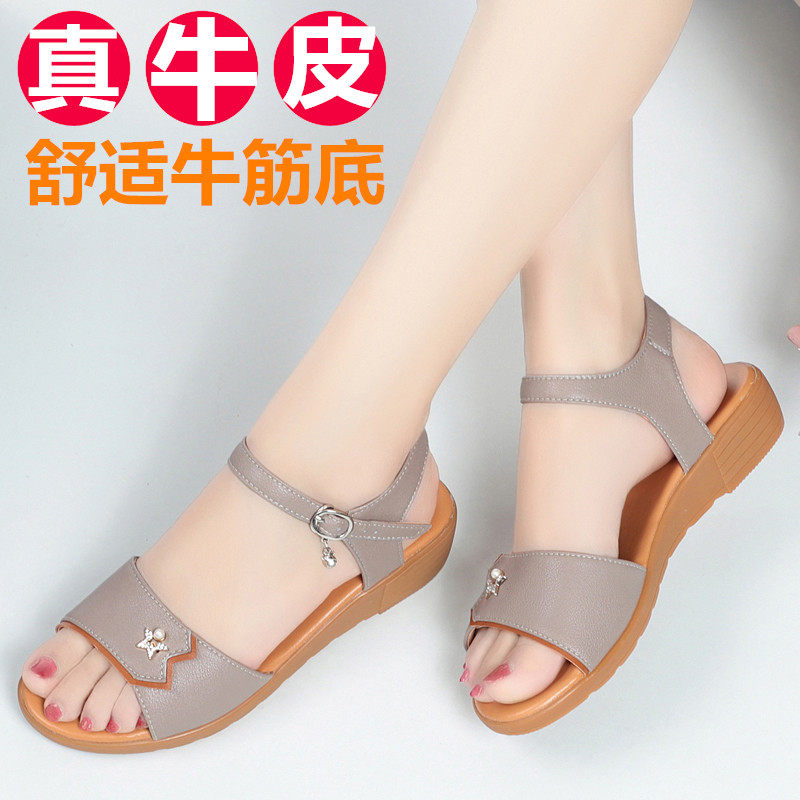 妈妈凉鞋真皮软皮软底夏季新款舒适平底防滑低Q跟中老年人大码女