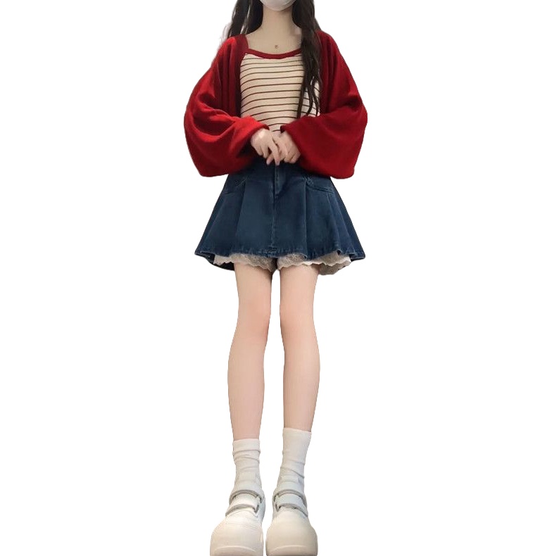 日系气质温柔风红色针织开衫+条纹吊带上衣+牛仔半身短裙三件套装