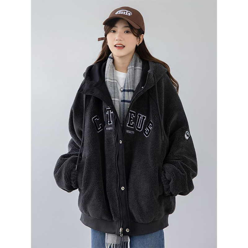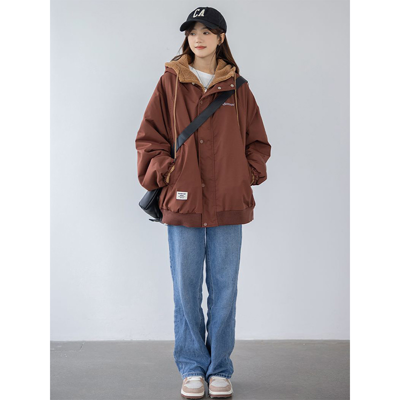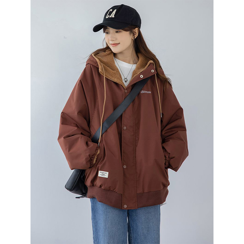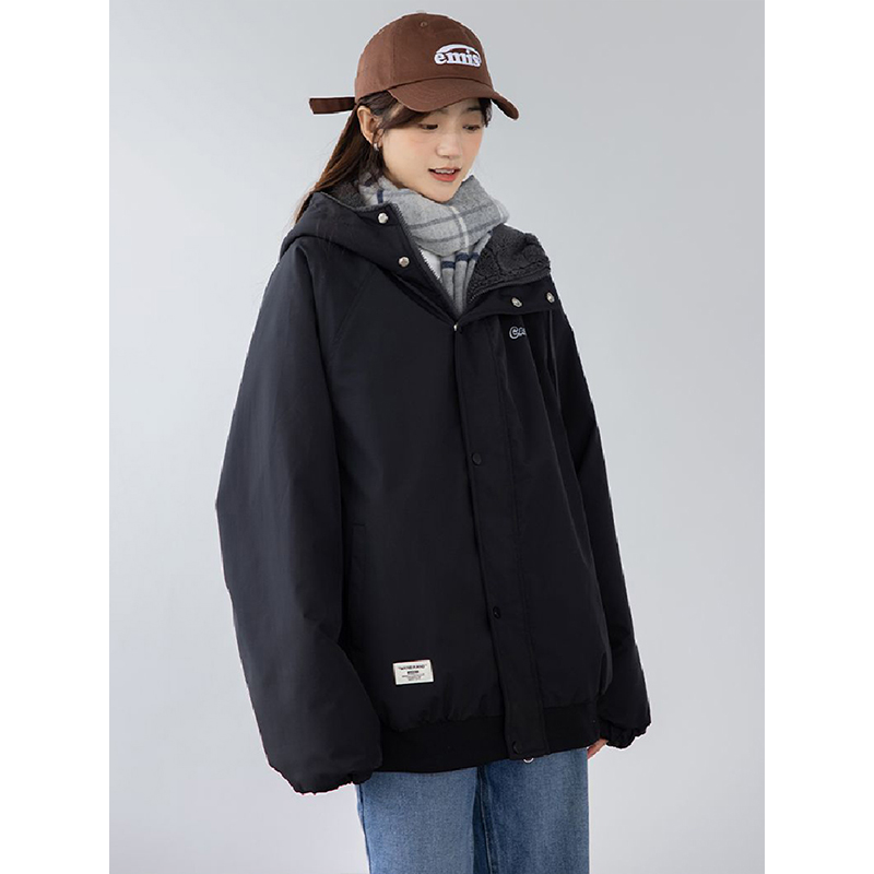 胖mm大码女装美式复古双面穿棉衣棉服冬季宽松连帽羊羔毛加厚外套