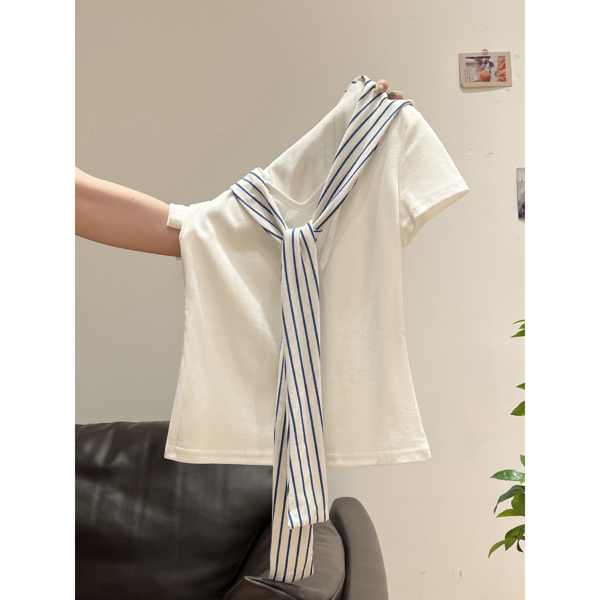 甜辣妹条纹海军领短款T恤女2025夏季新款高级感V领修身短袖上衣潮
