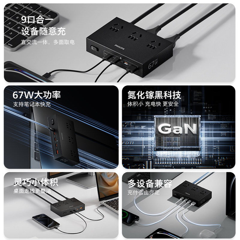 飞利浦氮化镓快充USB充电排插
