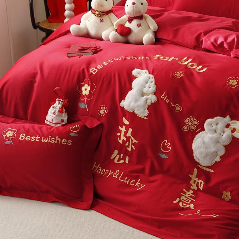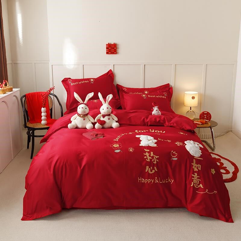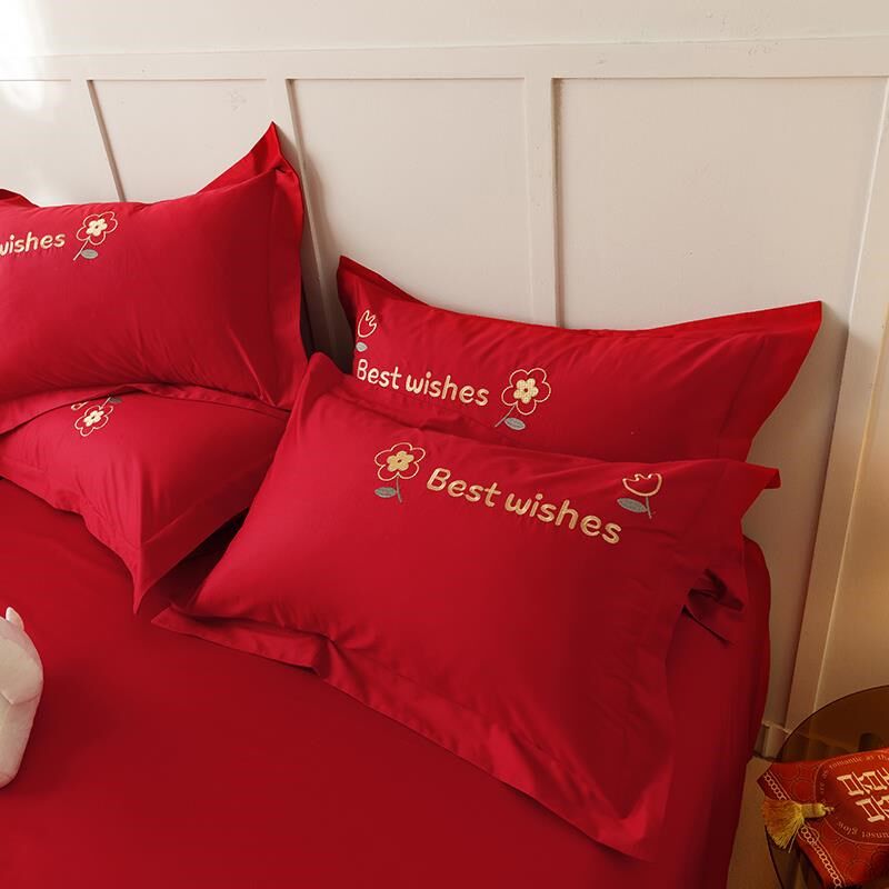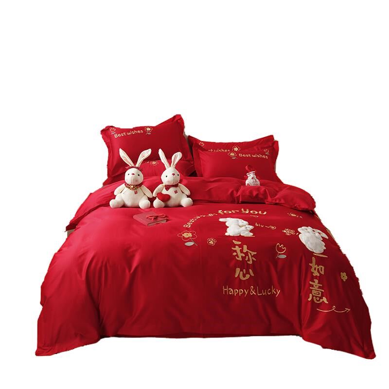 高档简约婚庆四件套纯棉大红色床单刺绣被套全棉结婚X床上用品新