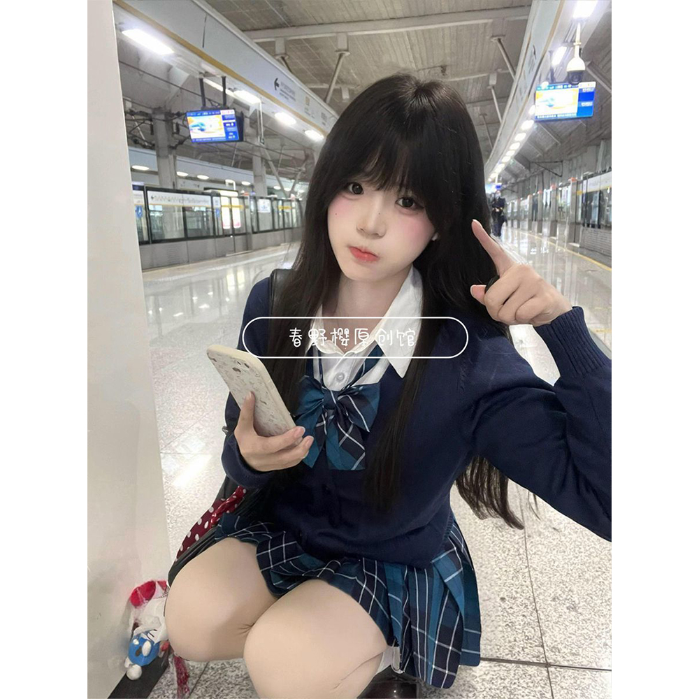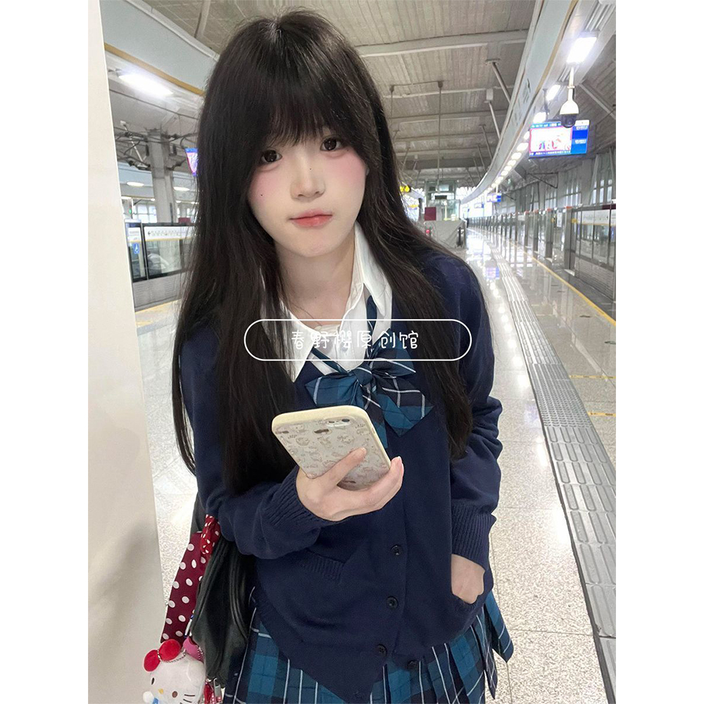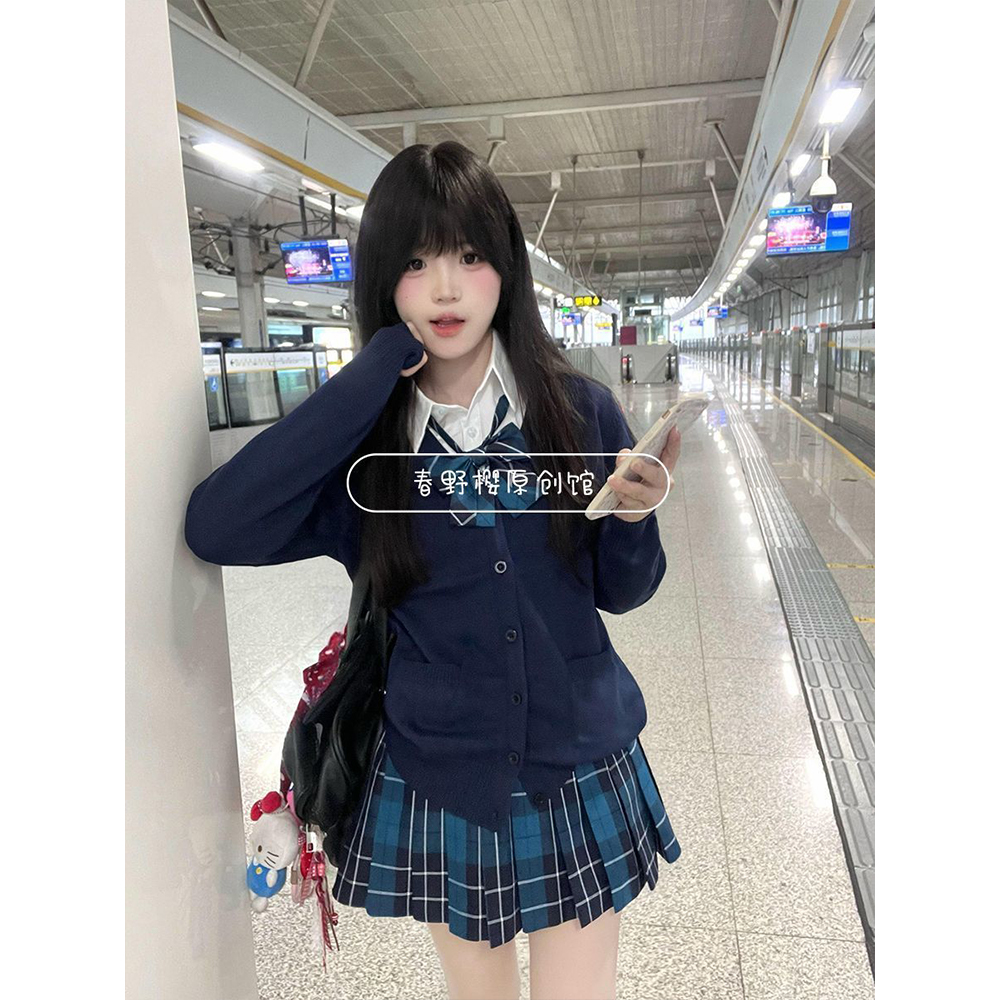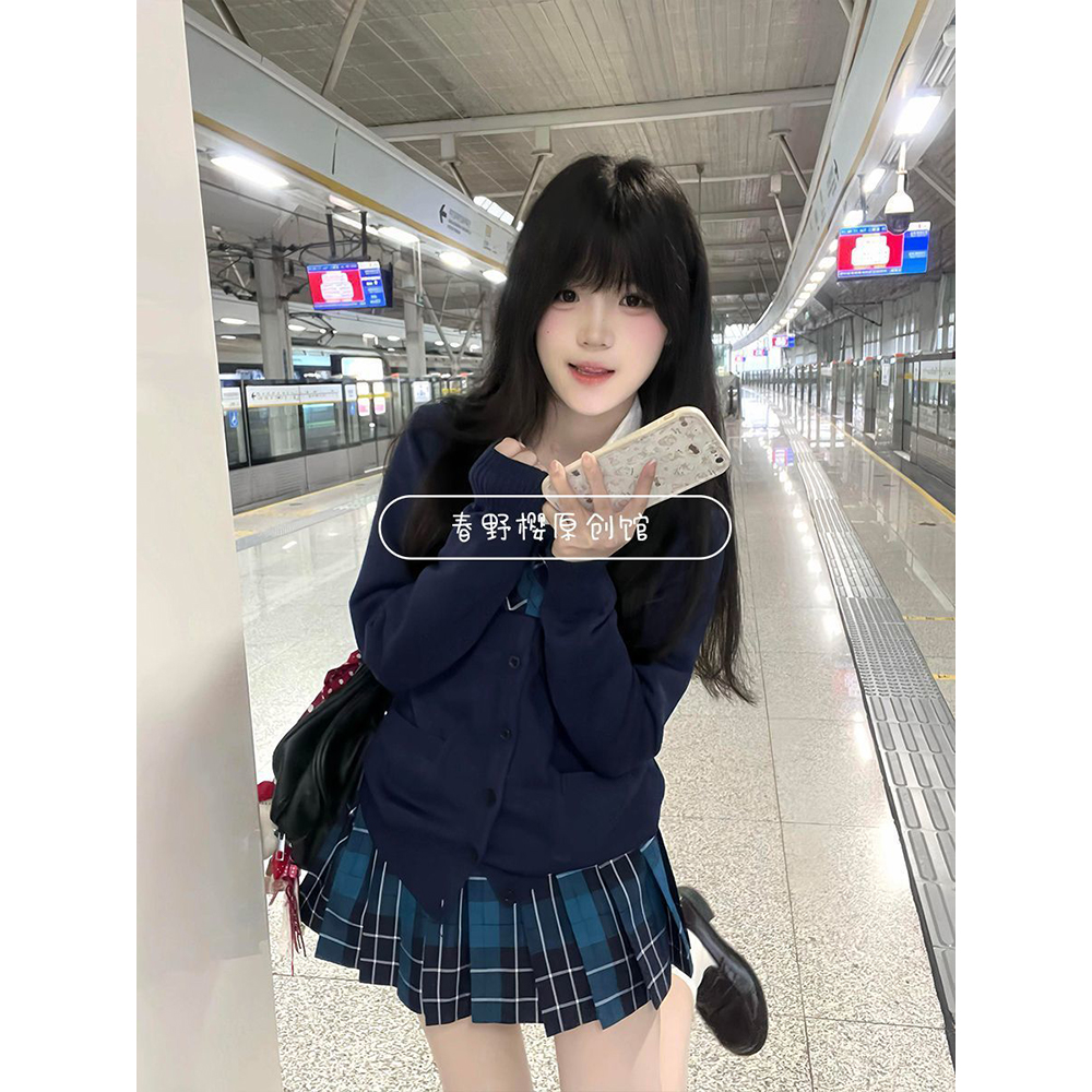 原创JK制服针织衫开衫毛衣外套叠穿漫感长袖上衣短裙百褶套装春秋