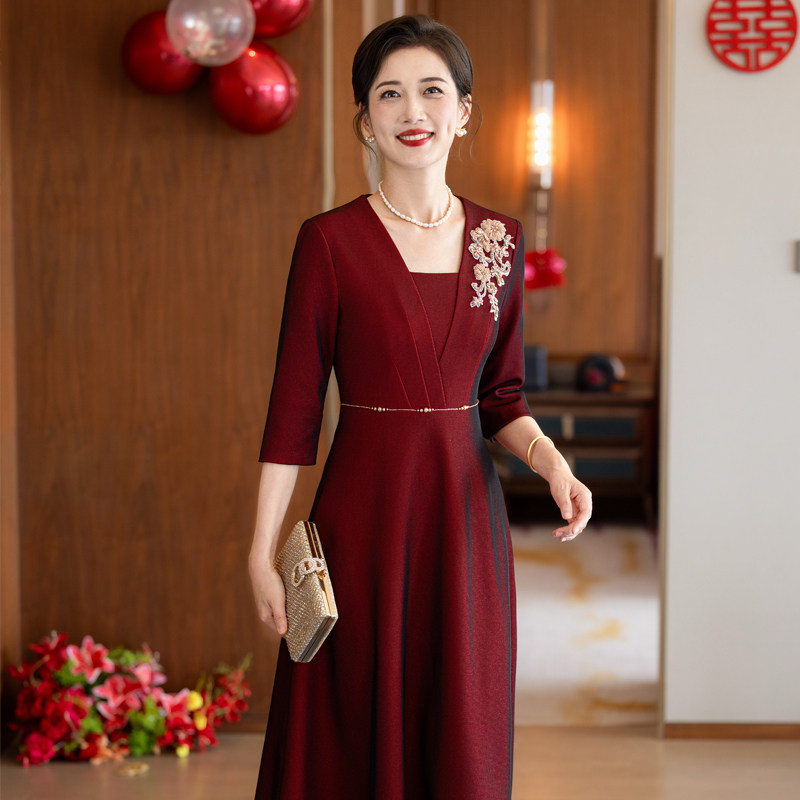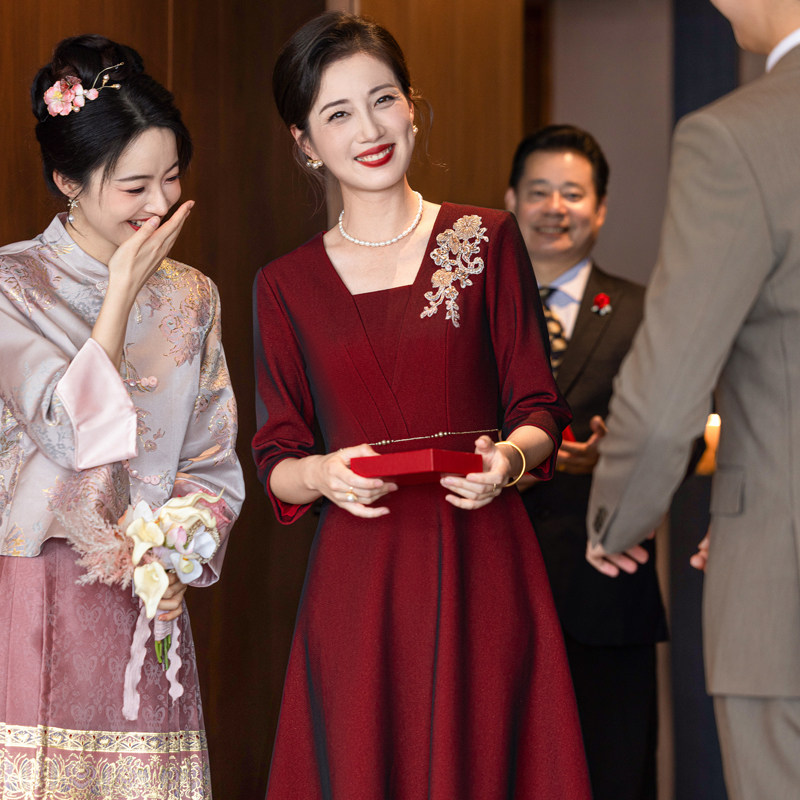 喜婆婆婚宴装礼服裙2025秋冬新款妈妈装气质优雅钉珠酒红色连衣裙
