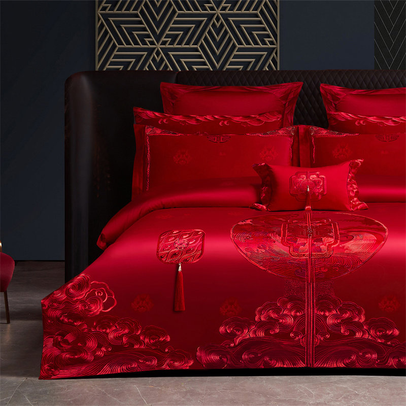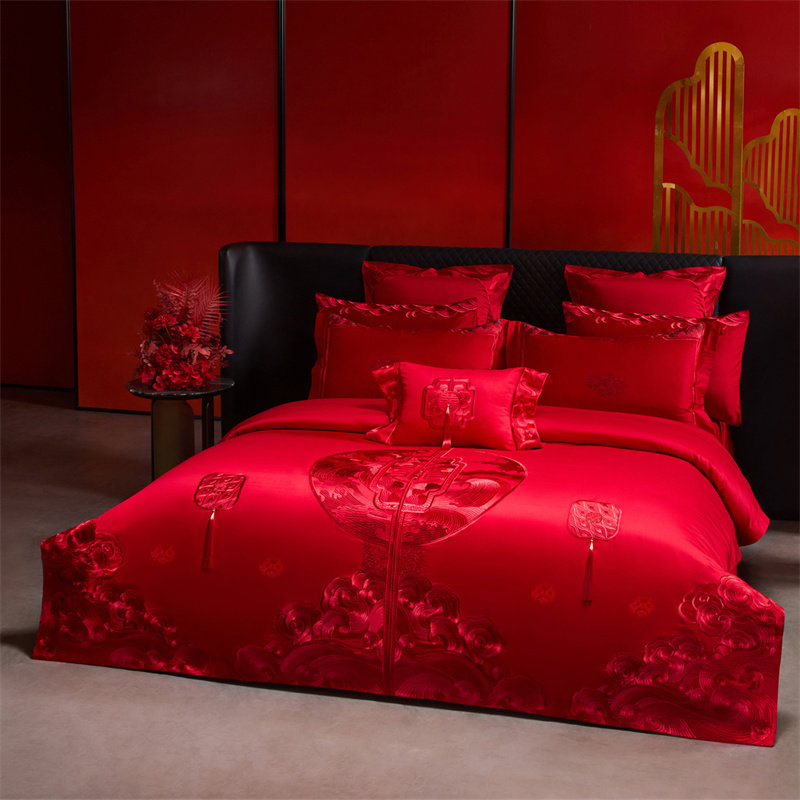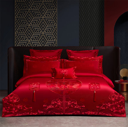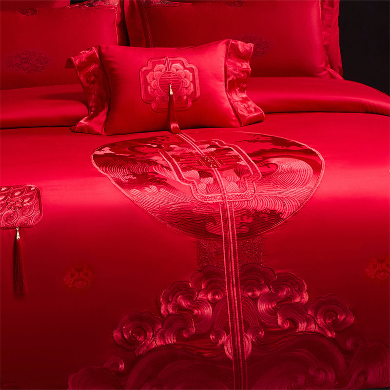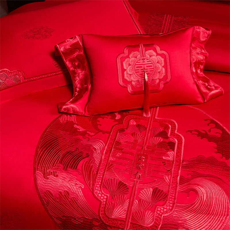 良缘阁长绒棉刺绣婚庆四件套喜庆结婚床上用品全棉红床单被套新婚