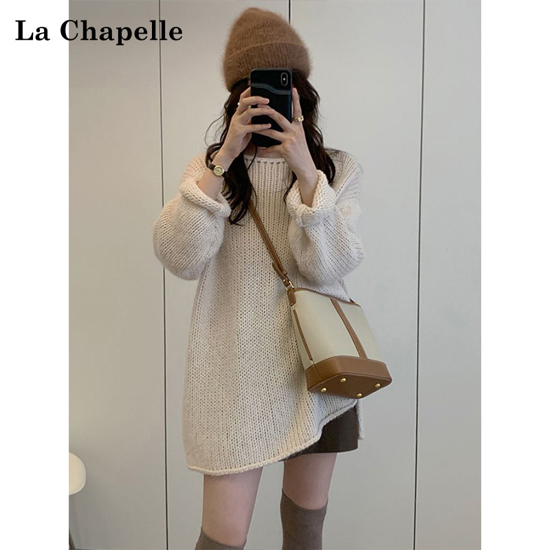 拉夏贝尔杏色镂空中长款针织衫女秋季新款开叉宽松罩衫长袖上衣