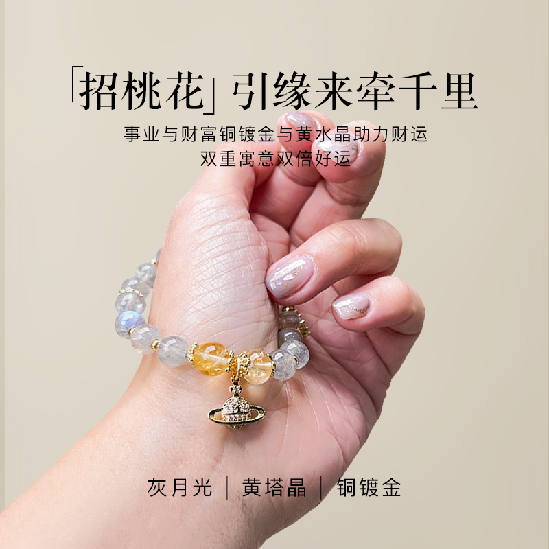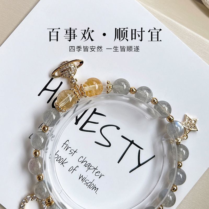 天然灰月光星月水晶手链女 轻奢小众高级感黄水晶手串铜镀金手饰