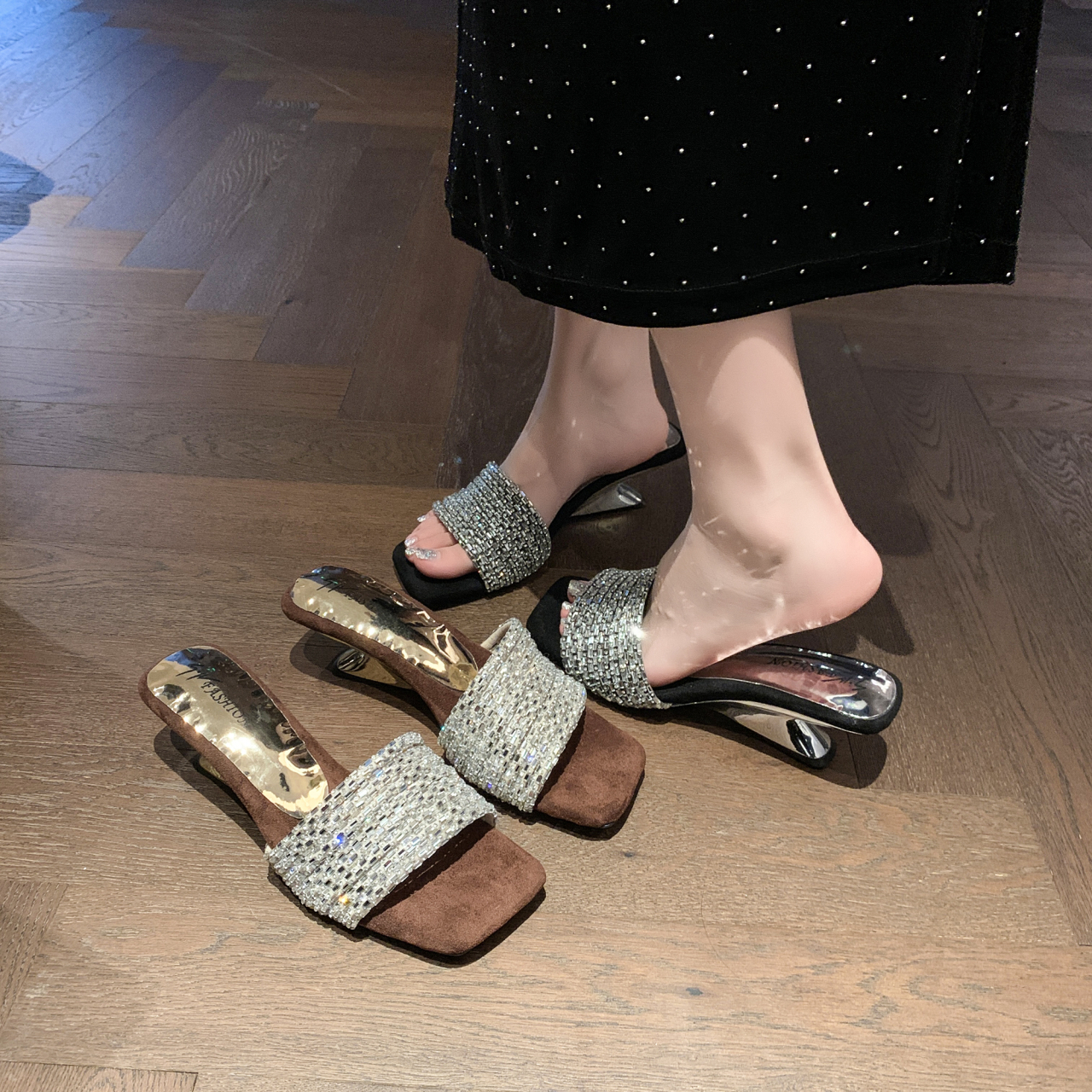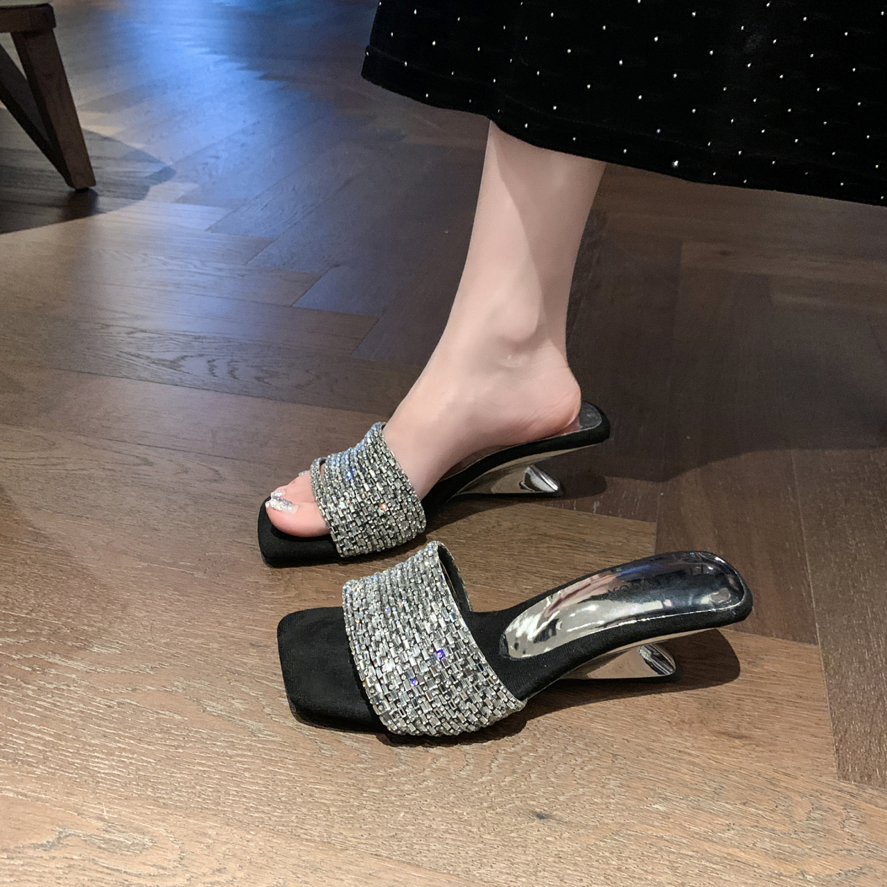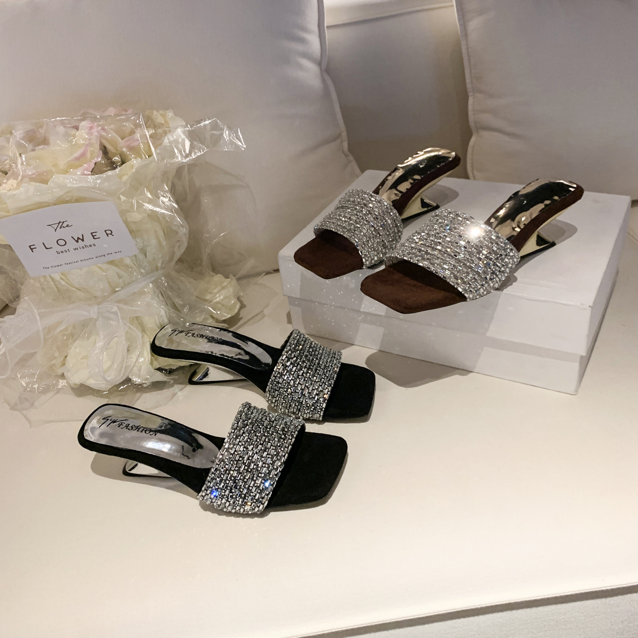 坡跟法式水钻一字拖鞋女夏外穿2025新款高级感高跟鞋小个子凉拖鞋