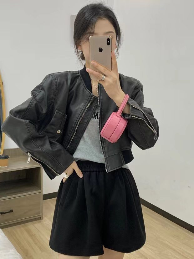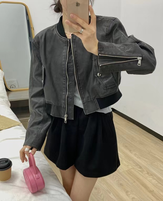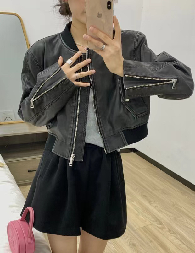 A732女装立领短款仿皮飞行员夹克外套皮衣短款做旧水洗皮机车服