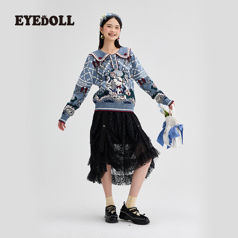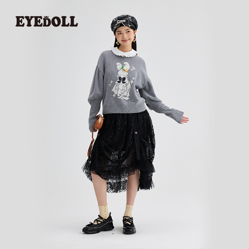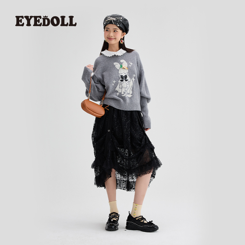 EYEDOLL 法式复古百搭珠片绣蕾丝网纱设计A字半身裙中长裙早秋