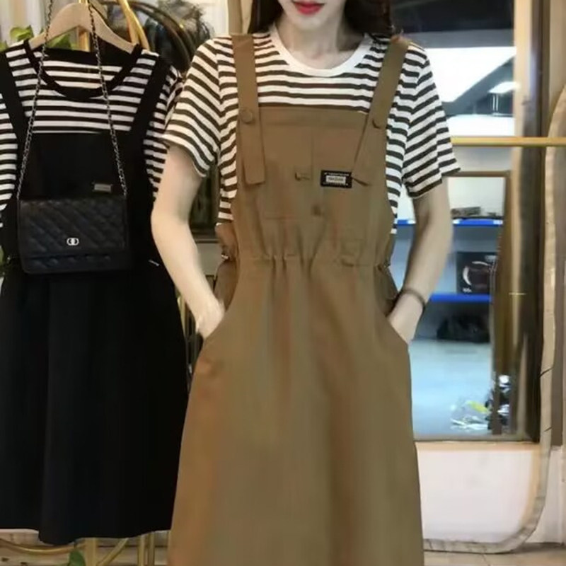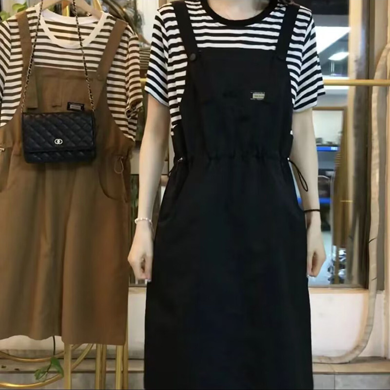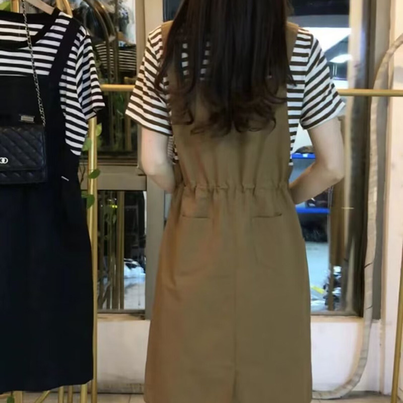 假两件条纹拼接连衣裙2024夏季新款收腰显瘦时尚设计感宽松背带裙