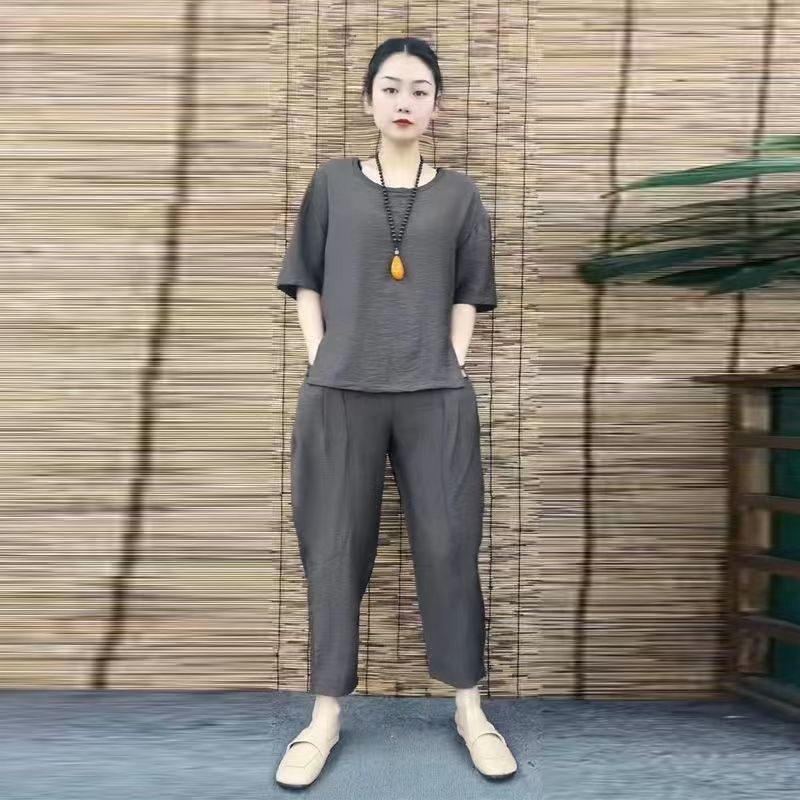 中老年妈妈夏季新款宽松休闲套装时尚短袖显瘦上衣大码裤子两件套