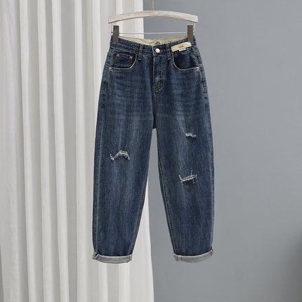 春夏高腰蓝色破洞牛仔裤女2025新款哈伦裤宽松显瘦百搭9分萝卜裤