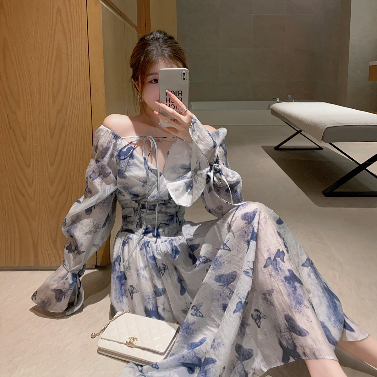ByYou夏季新款气质法式v领天丝蓝色碎花连衣裙收腰荷叶袖印花长裙