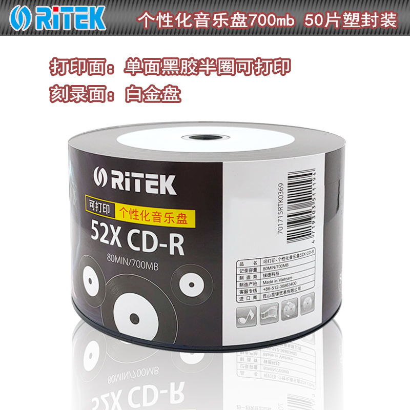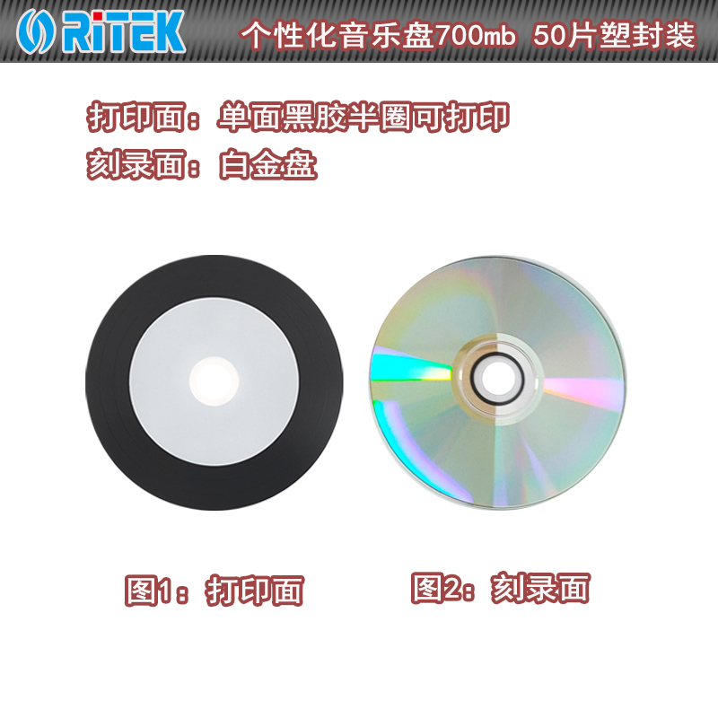 铼德(RITEK) 半圈黑胶可打印面 白金音乐盘 CD-R 52速700M 空白光盘/光碟/白金刻录盘/车载 塑封装50片