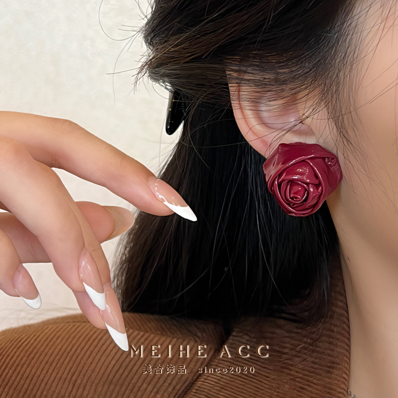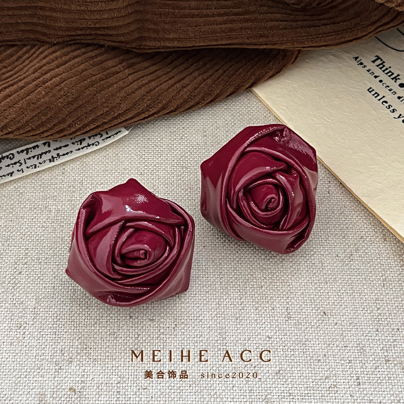 无尽温柔~法式复古暗红色玫瑰花朵仿皮质耳钉优雅高级感耳环耳饰