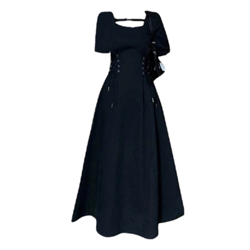 大码胖mm甜辣设计感方领系带收腰黑色牛仔连衣裙女夏显瘦中长裙子