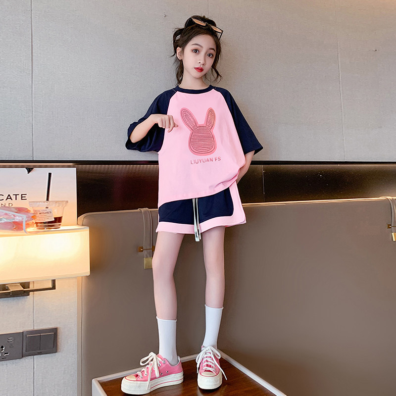 女童夏装套装2023新款洋气女大童纯棉短袖T恤儿童夏季休闲两件套t