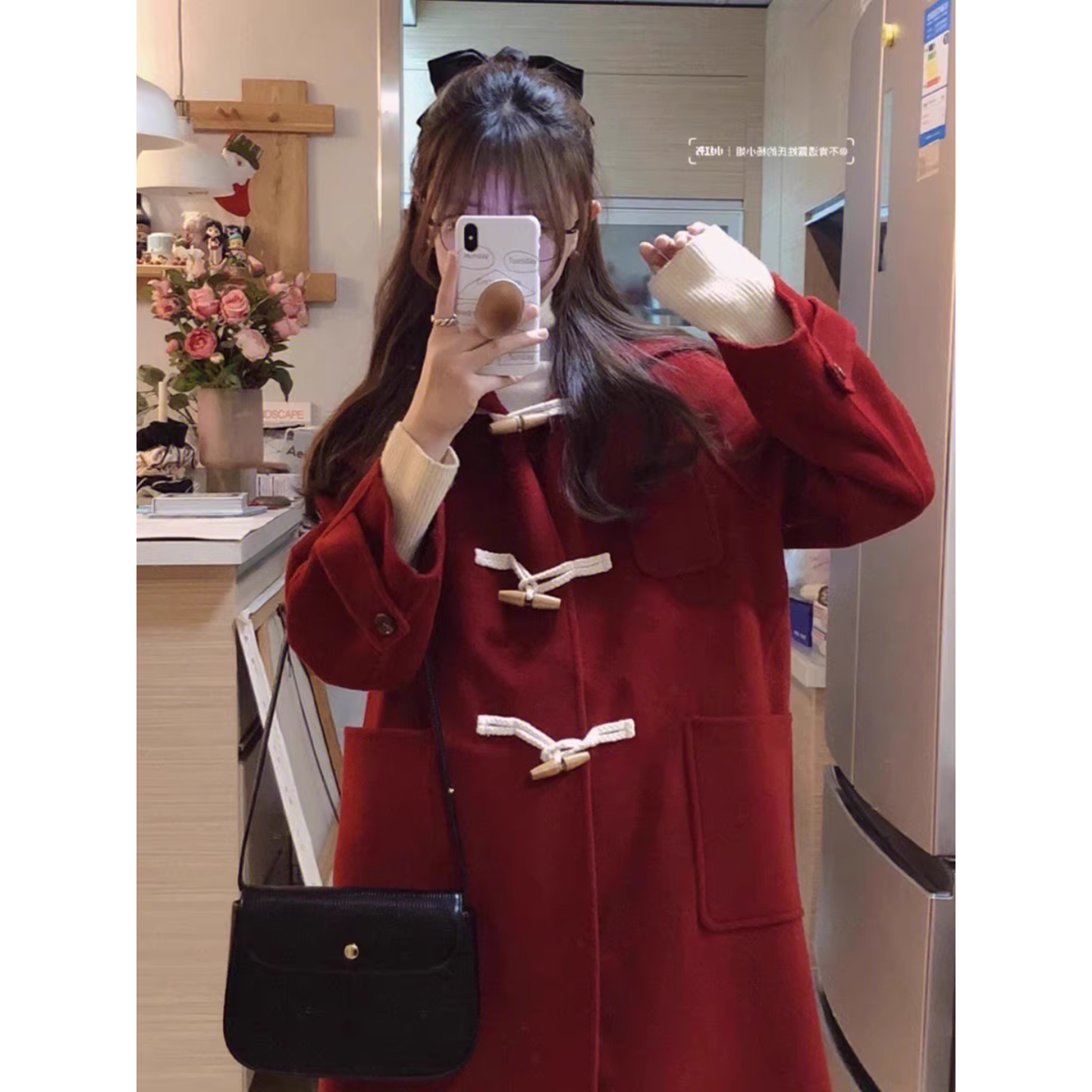 赫本风红色圣诞牛角扣毛呢双面大衣女秋冬新款加绒加厚外套赫本风