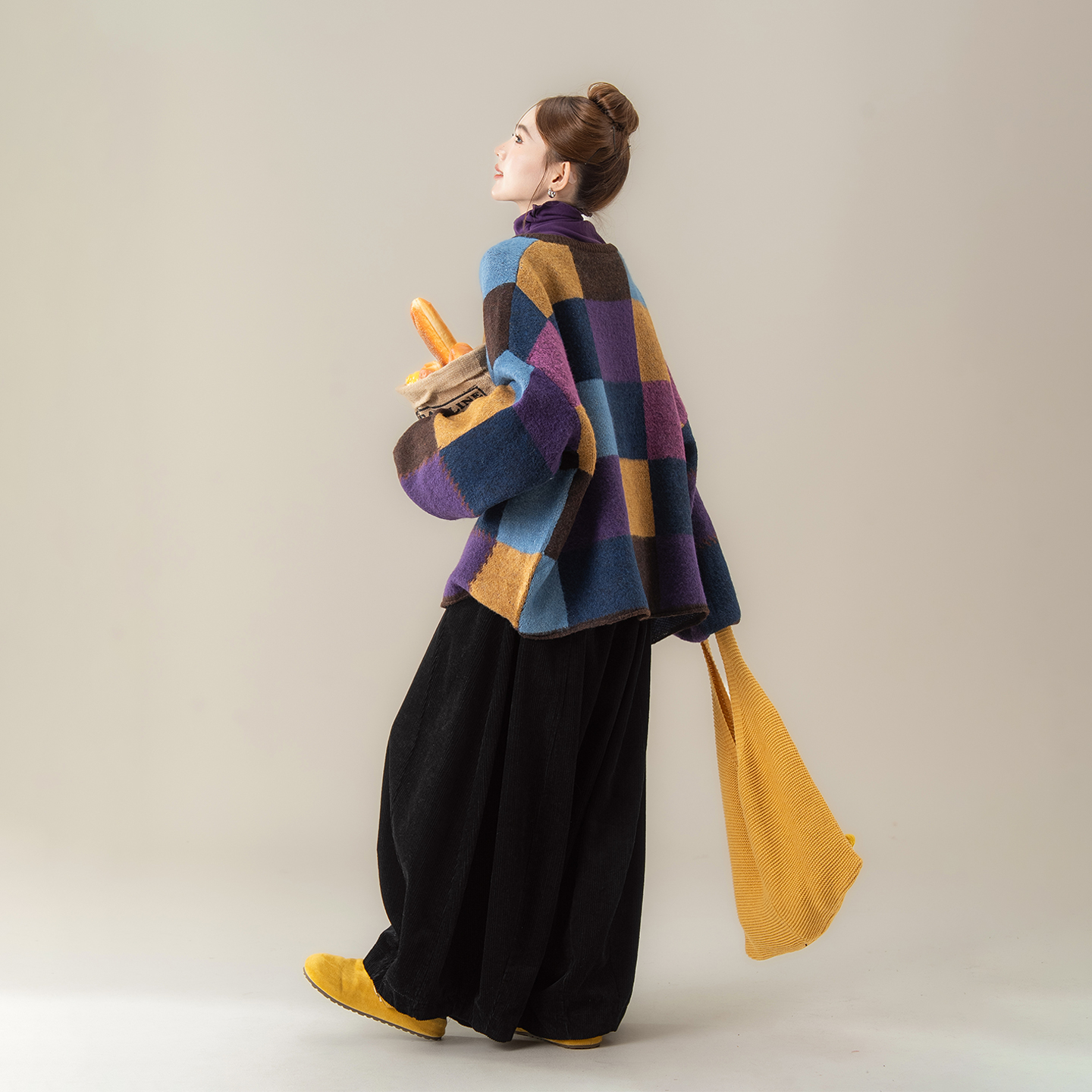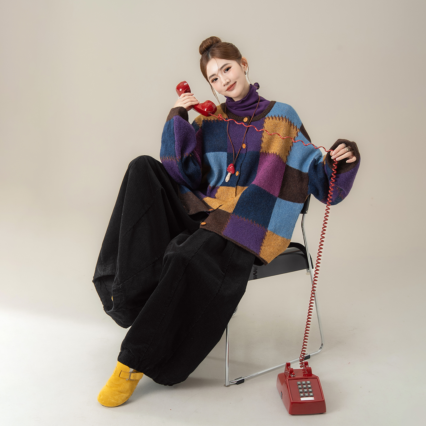 紫色格子拼接毛衣外套女秋季新款韩系宽松慵懒风显瘦长袖针织开衫