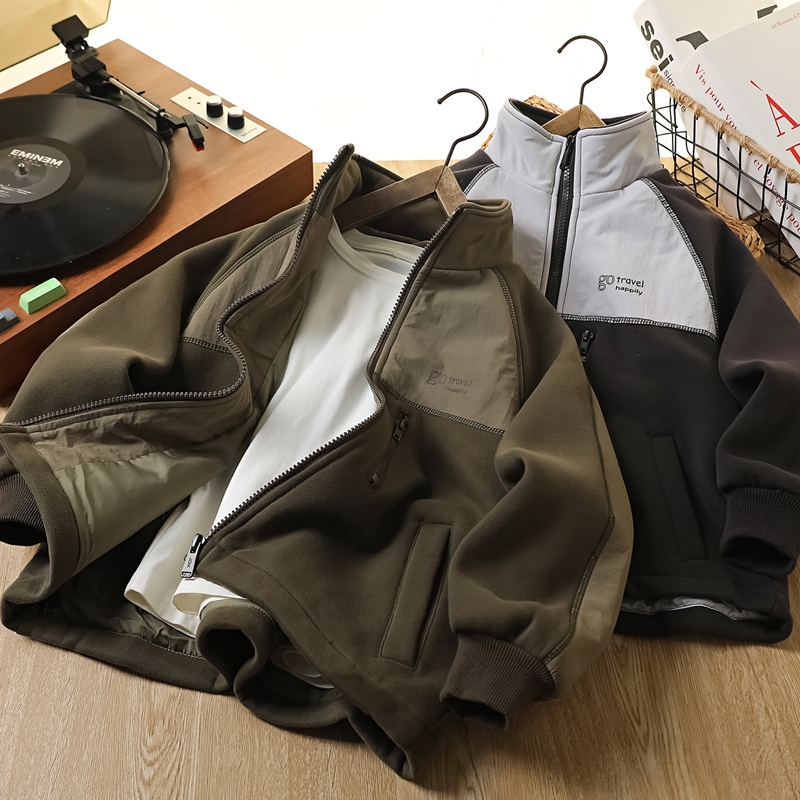 男童摇粒绒外套春秋款2025中大童男孩针织拼色儿童休闲立领夹克