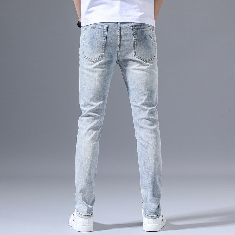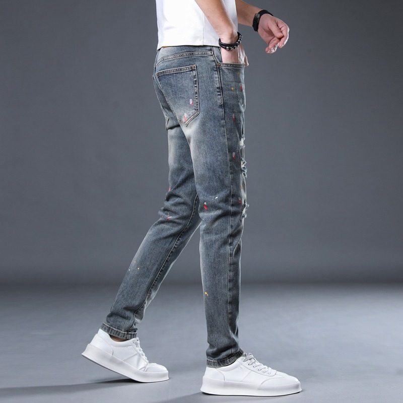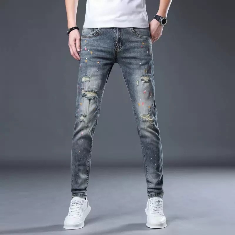 潮牌破洞牛仔裤男士2024夏季新款漆点泼墨修身小脚休闲百搭九分裤