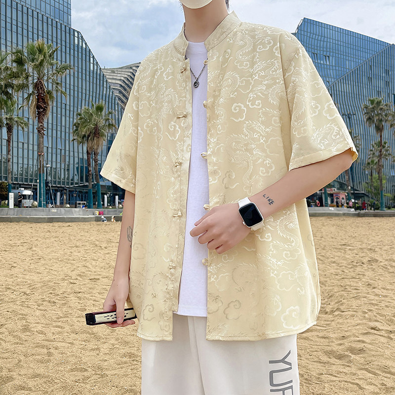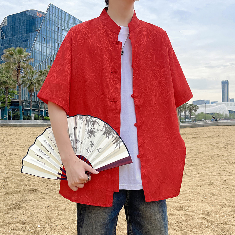 夏季盘扣竹叶暗纹新中式唐装男复古中国风短袖衬衫立领中山装