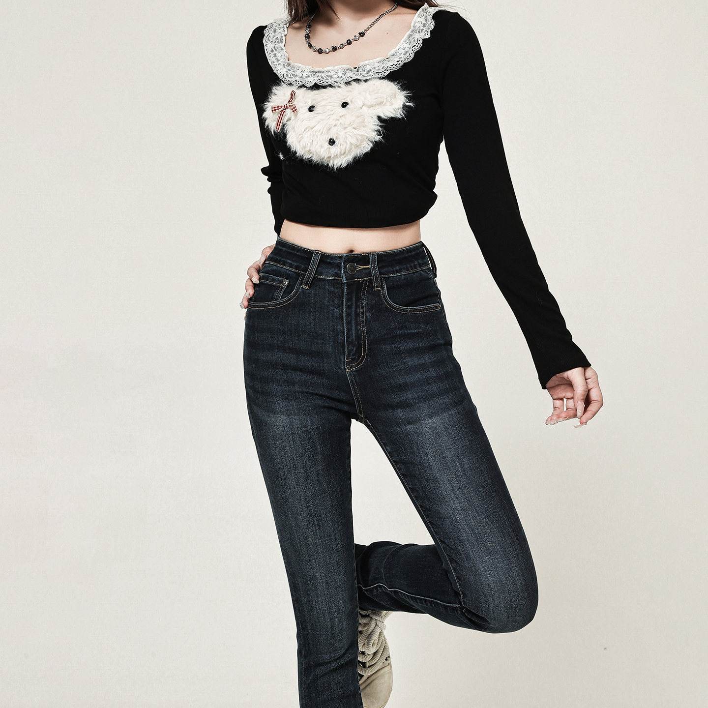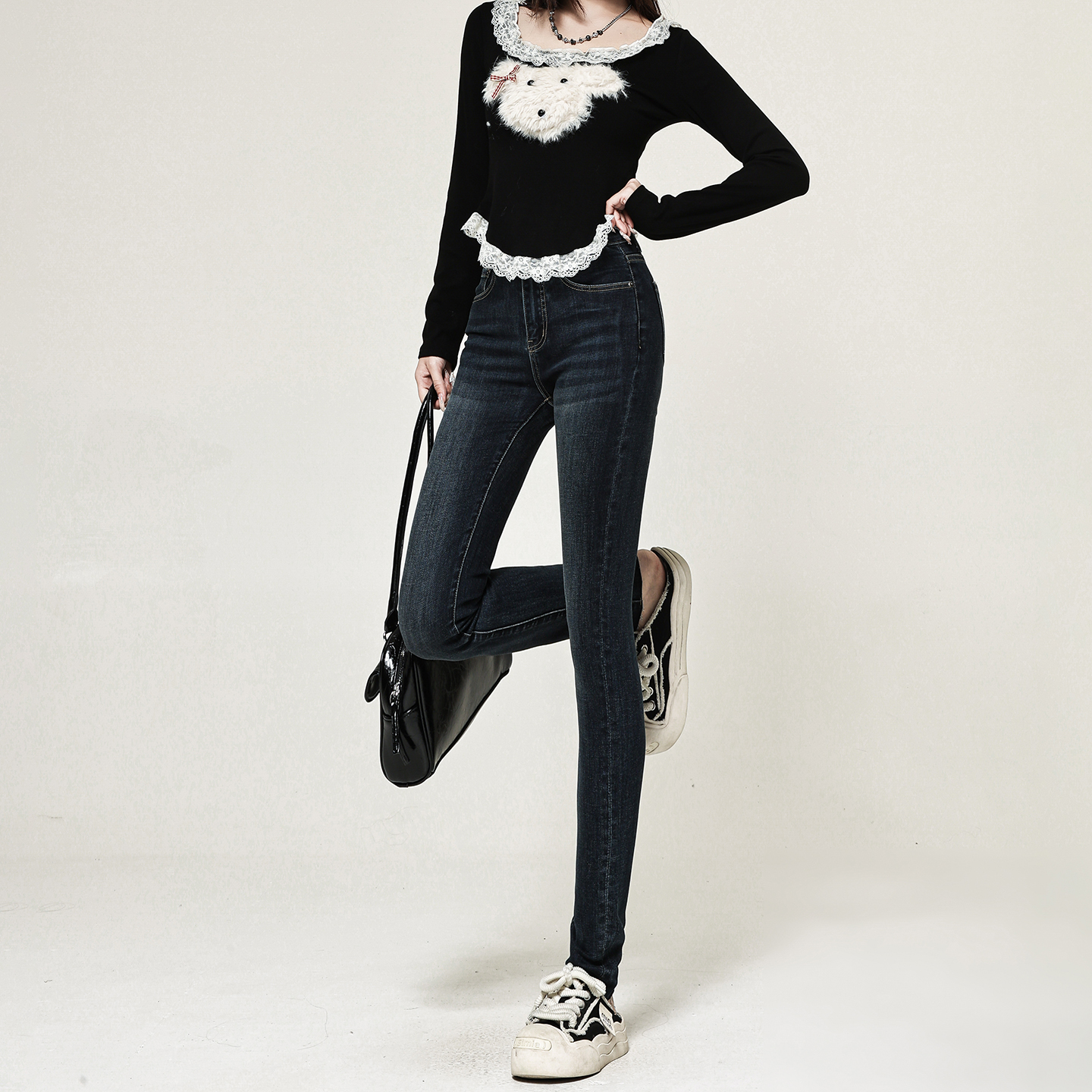 深蓝色小脚牛仔裤女2025秋季新款高腰修身显瘦小个子九分铅笔裤子