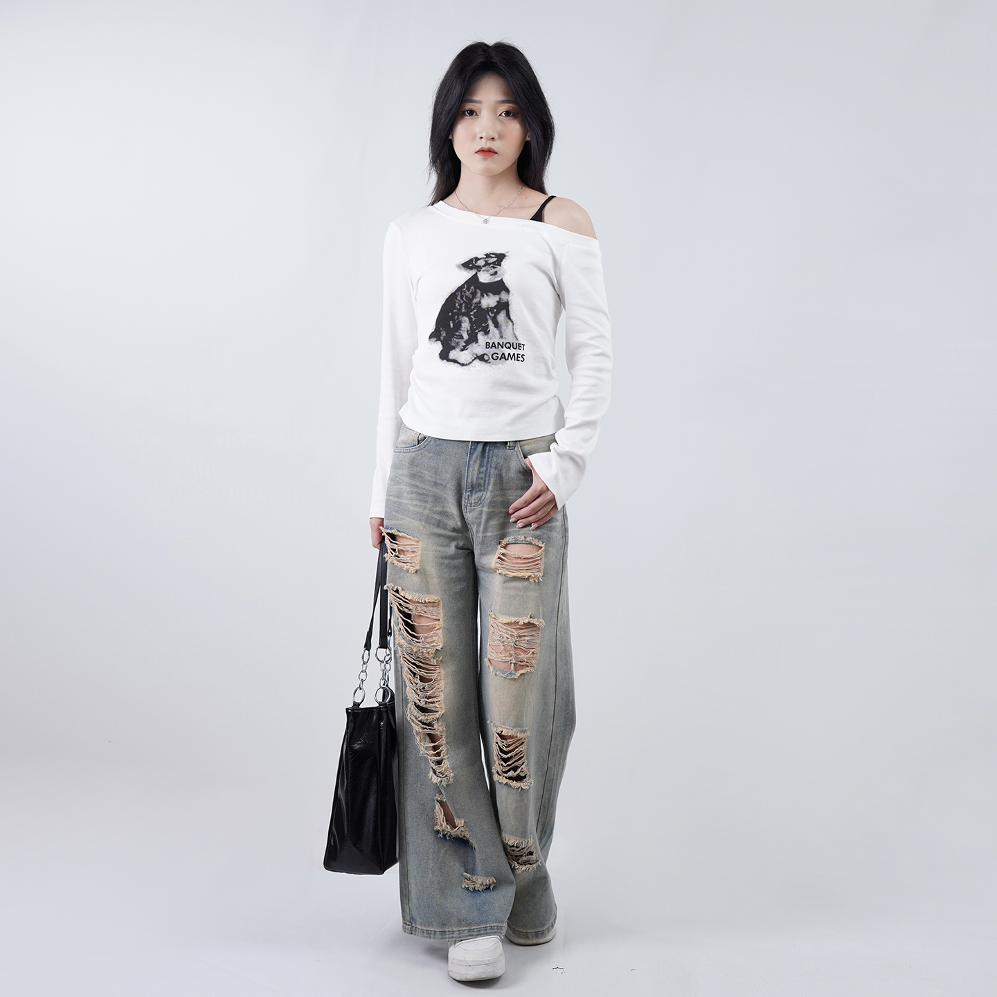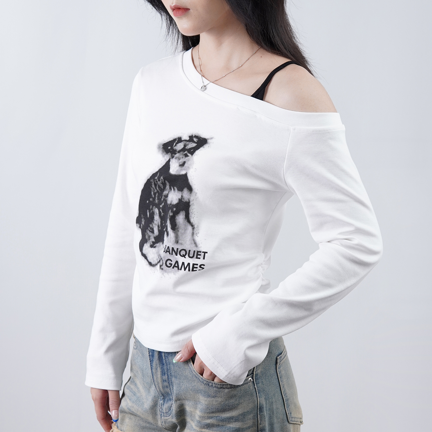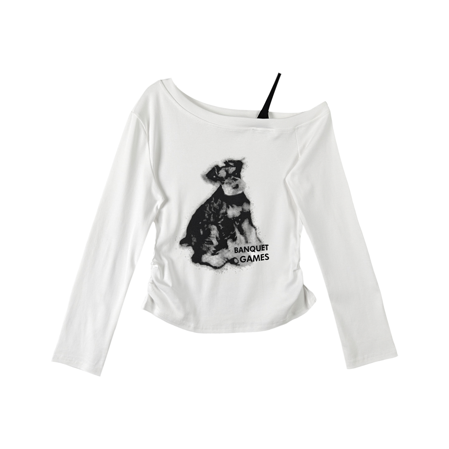 小狗印花白色斜肩长袖t恤女春秋新款褶皱收腰显瘦设计感露肩上衣