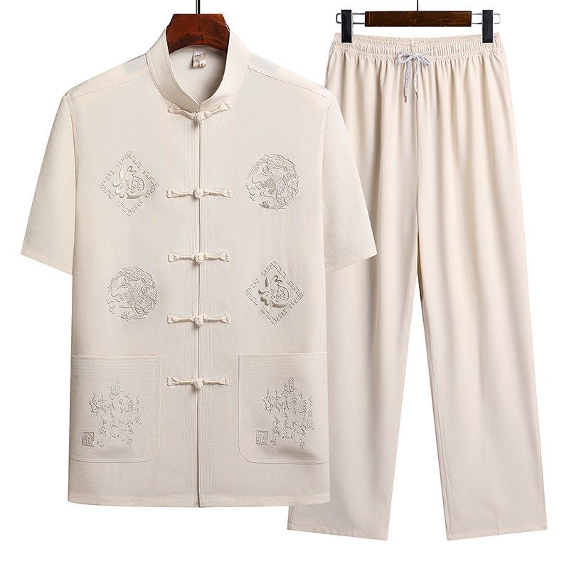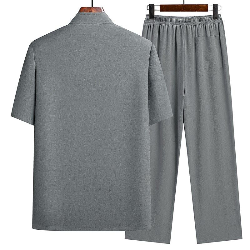 爸爸夏季套装男士短袖衬衫爷爷老人中国风唐装冰丝棉麻中老年衣服