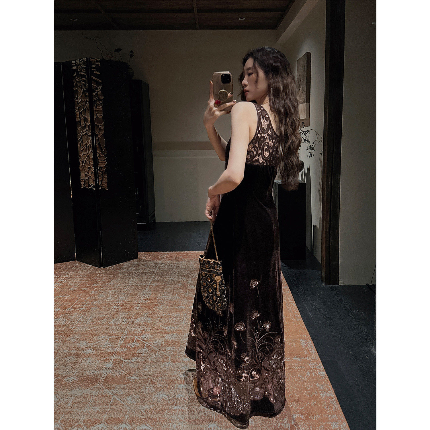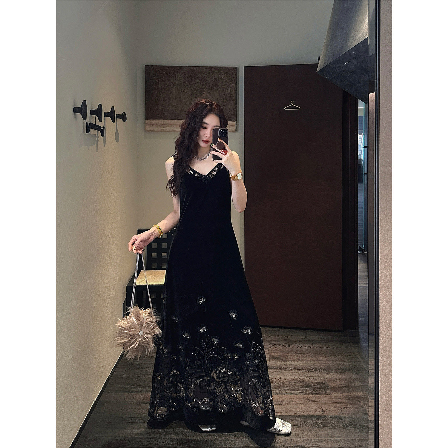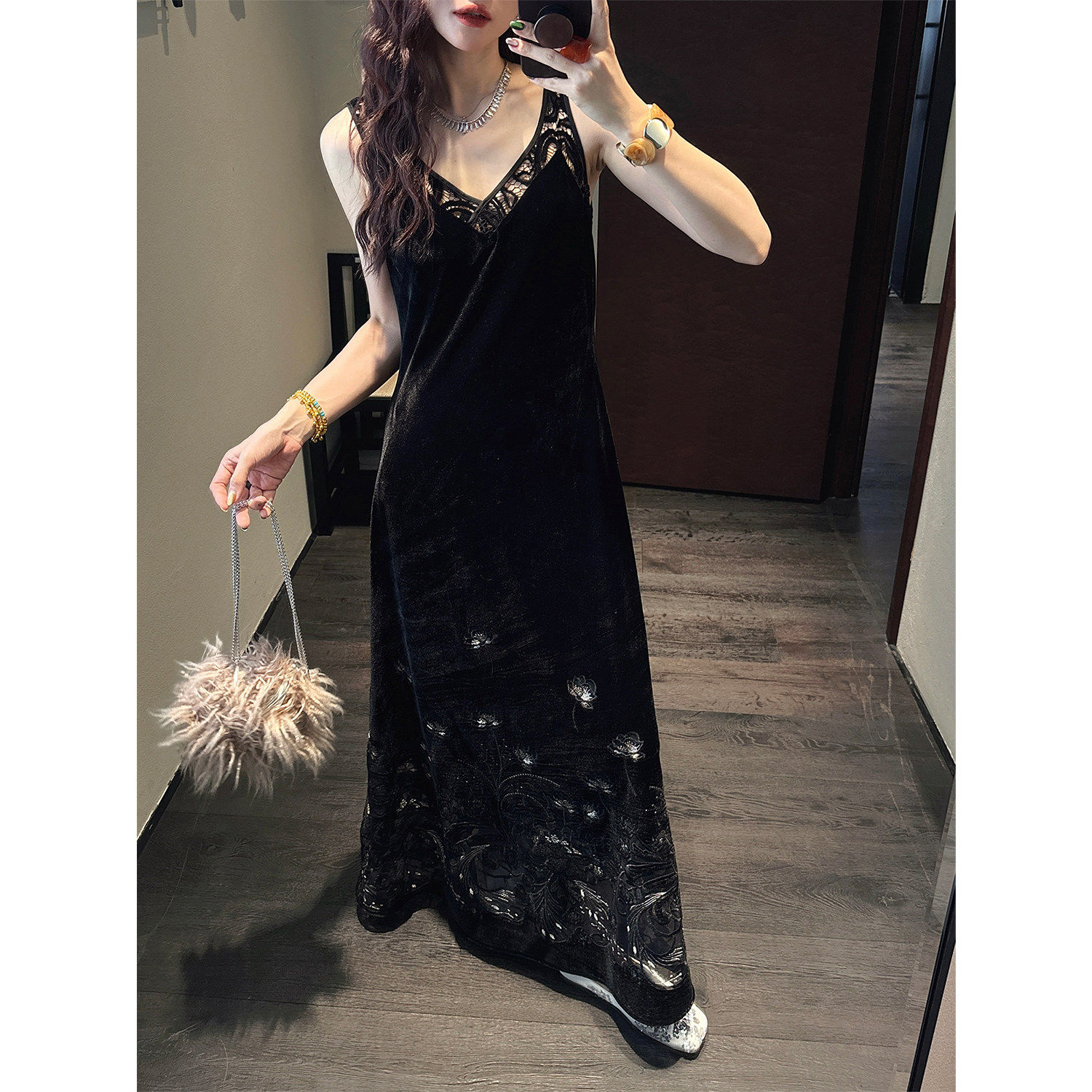 【夏天粉丝专享】三吉黑花【花本汐】蕾丝绒连衣裙子背心长裙