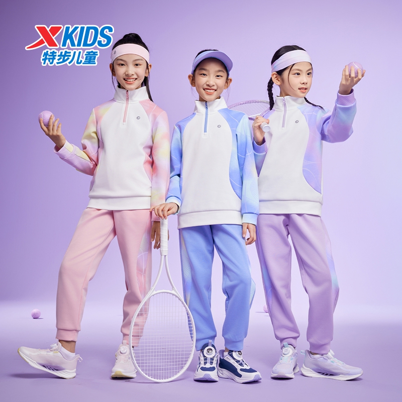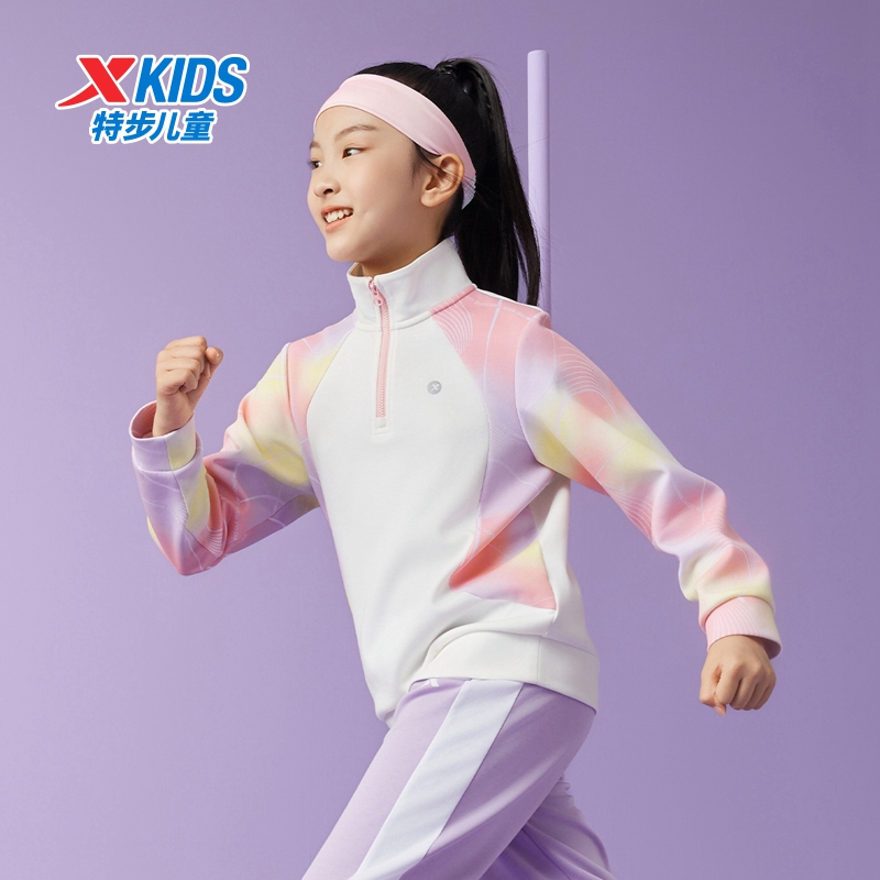 特步童装儿童半开襟卫衣小中大童2025年秋冬女童长袖加绒运动上衣