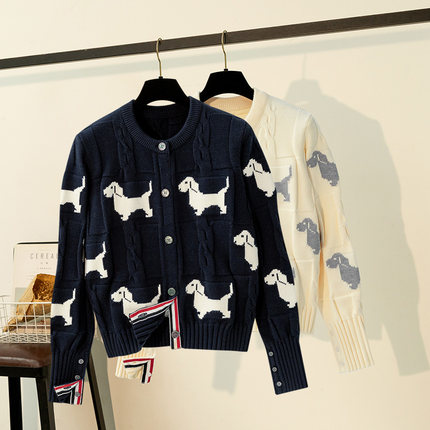 秋冬厚款圆领针织开衫女设计感小狗提花毛衣慵懒百搭麻花短款外套