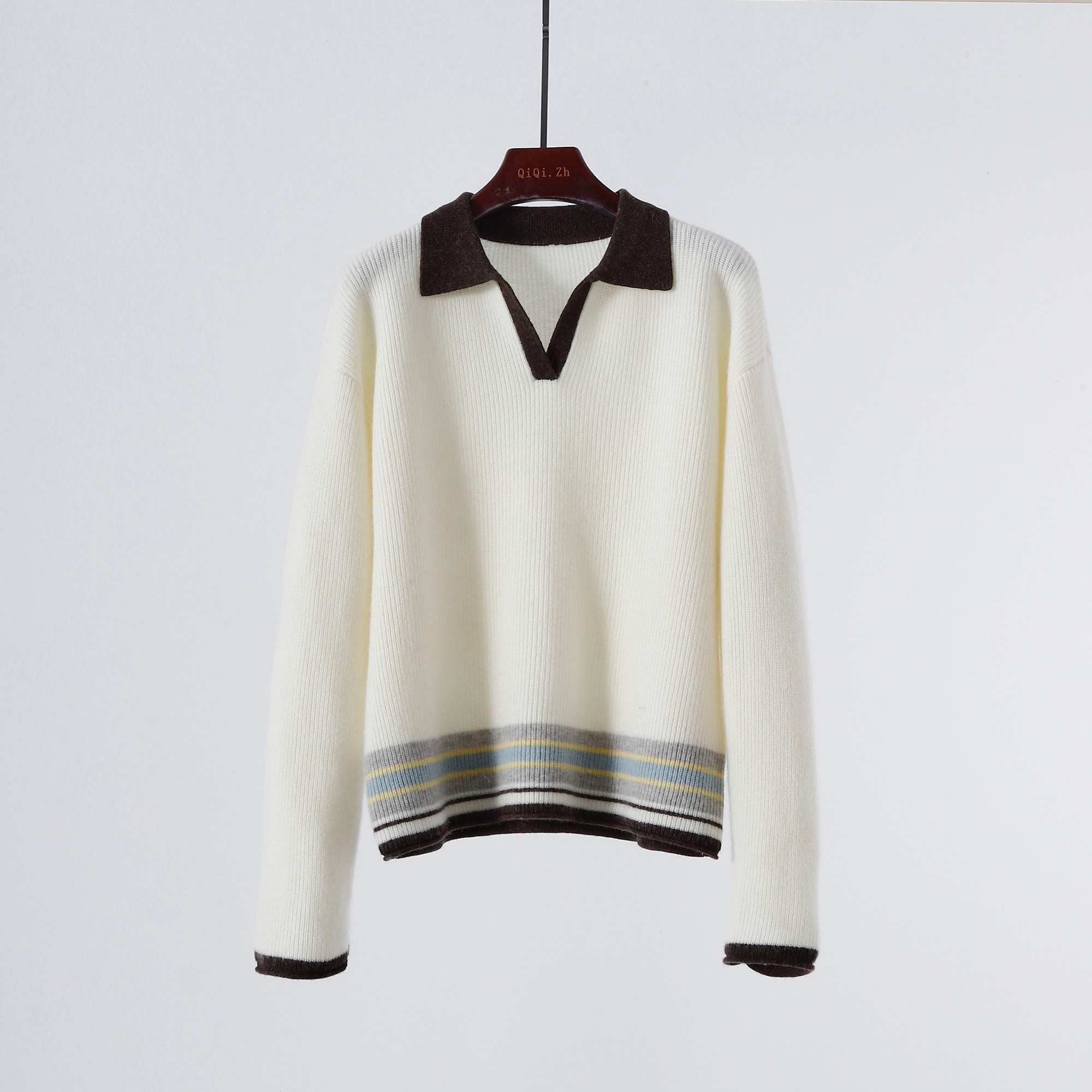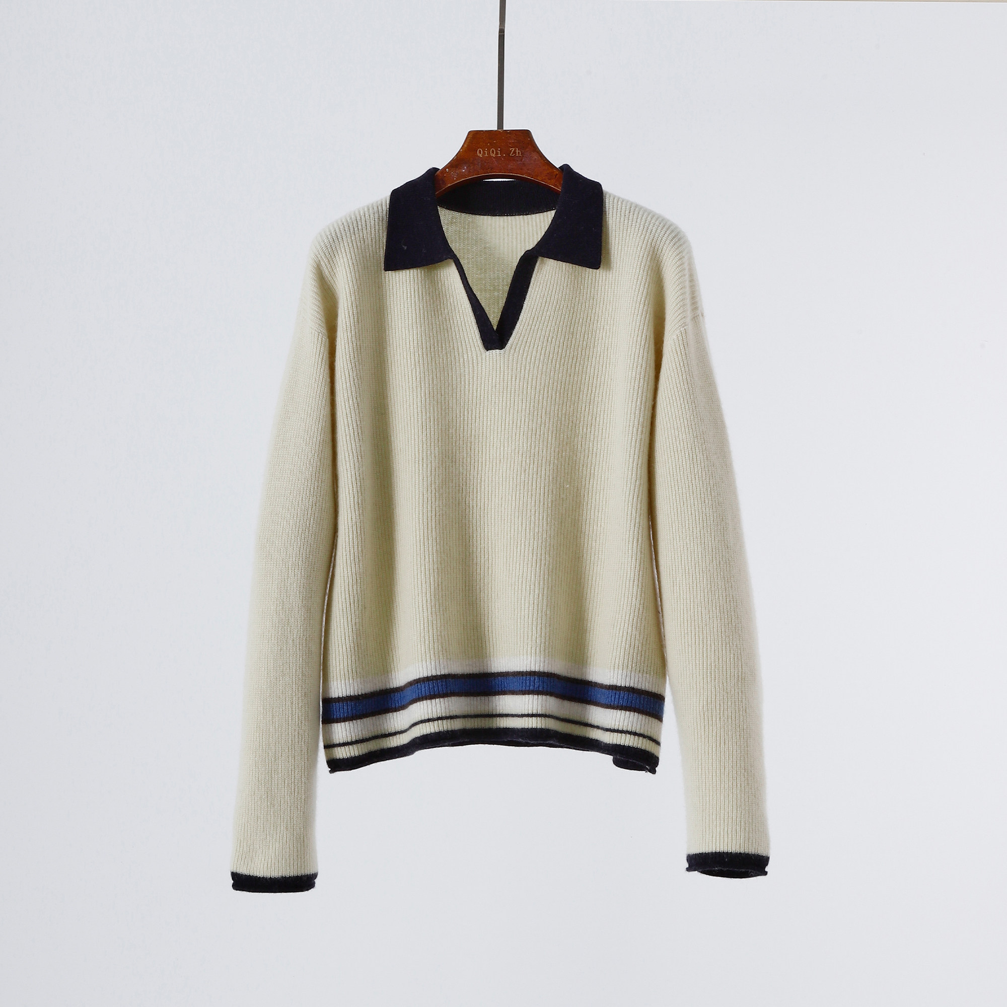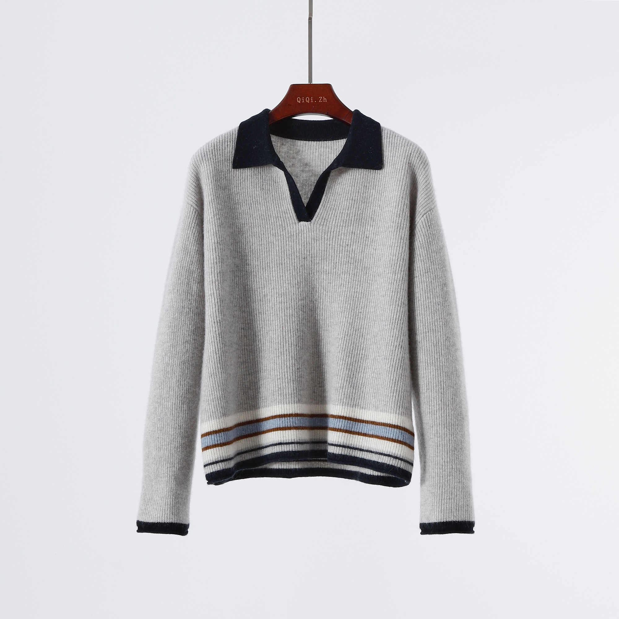 撞色POLO领羊绒衫女长袖宽松显瘦