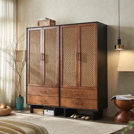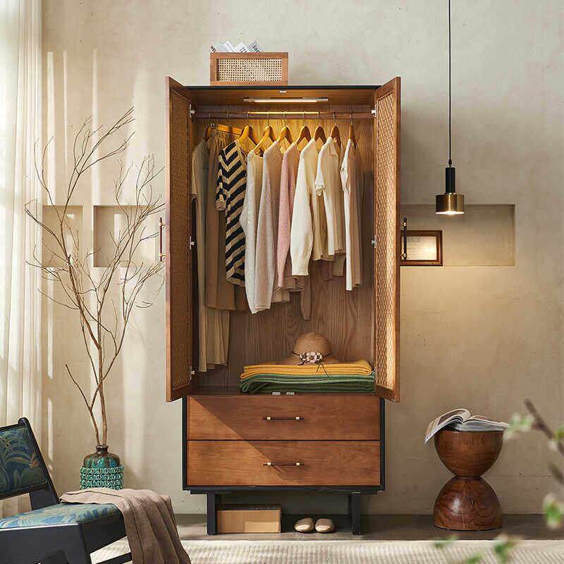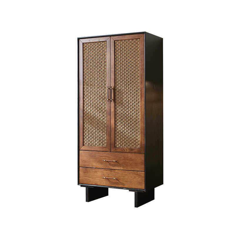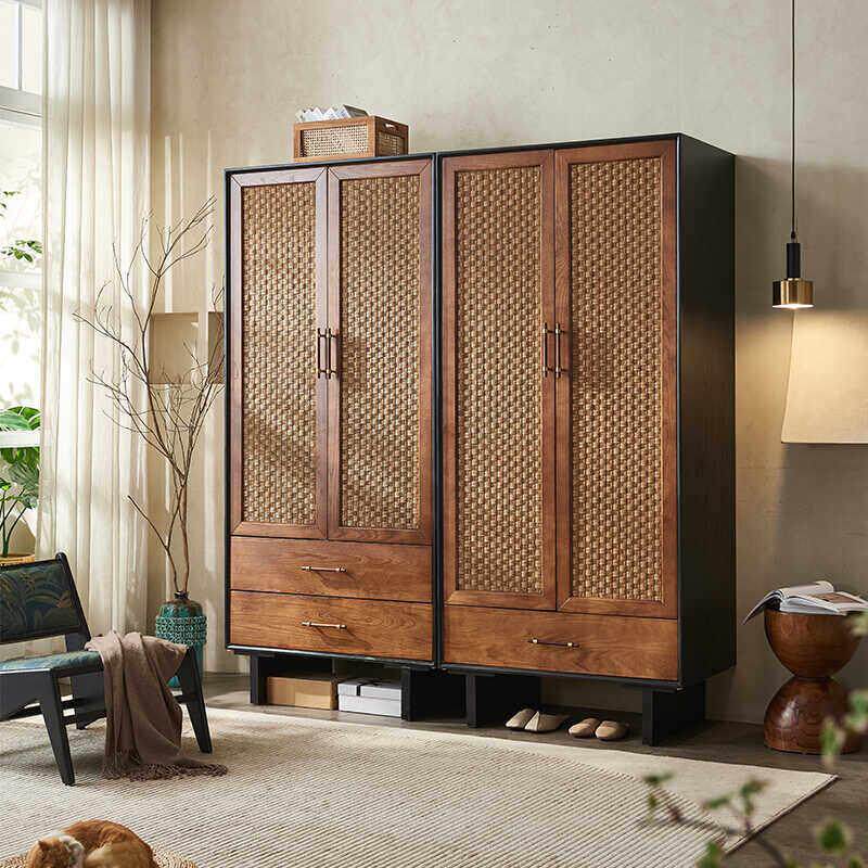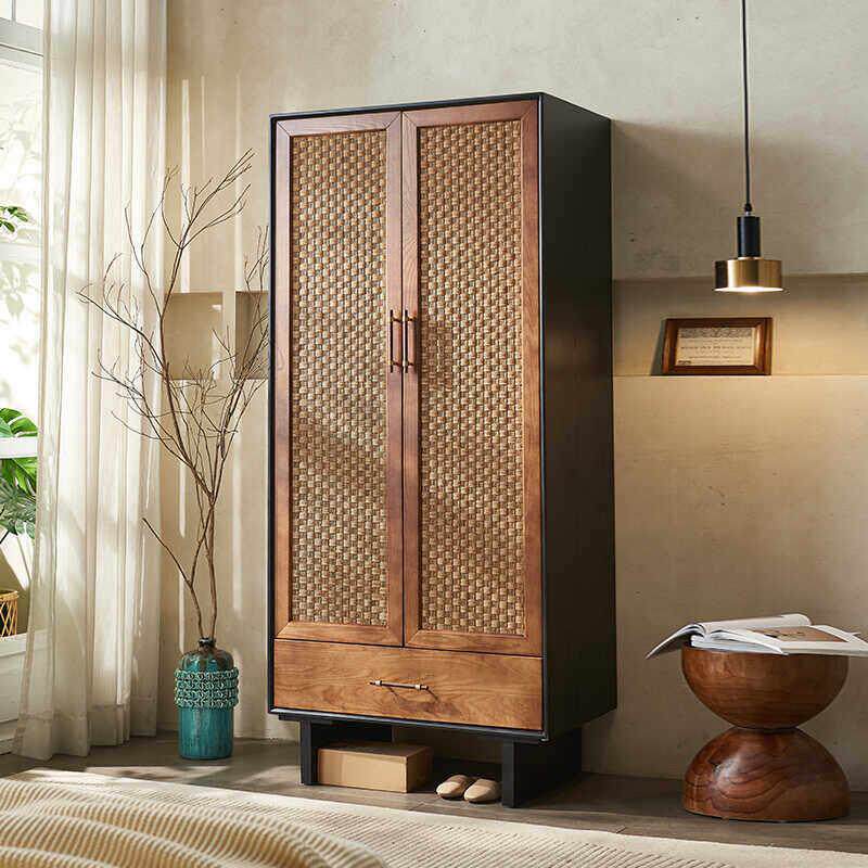 中古风实木藤编衣柜储物柜侘寂风覆古整体橱柜民宿卧室双门衣帽柜
