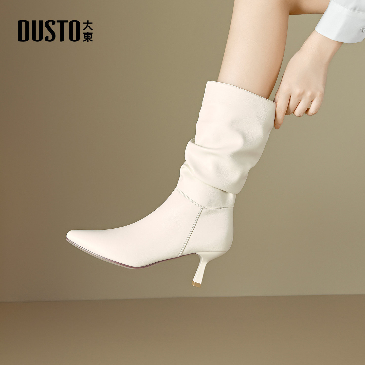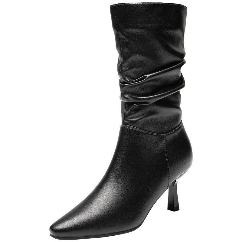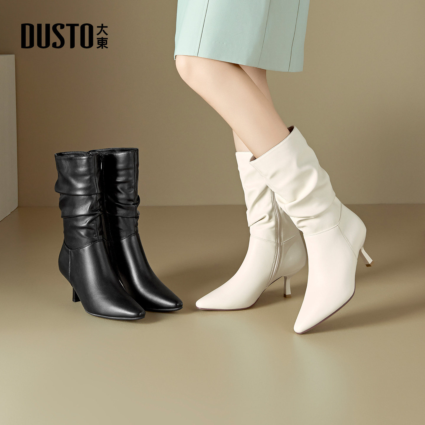 大东尖头短靴女2025新款冬季细跟显瘦靴子黑色中筒靴女士堆堆靴