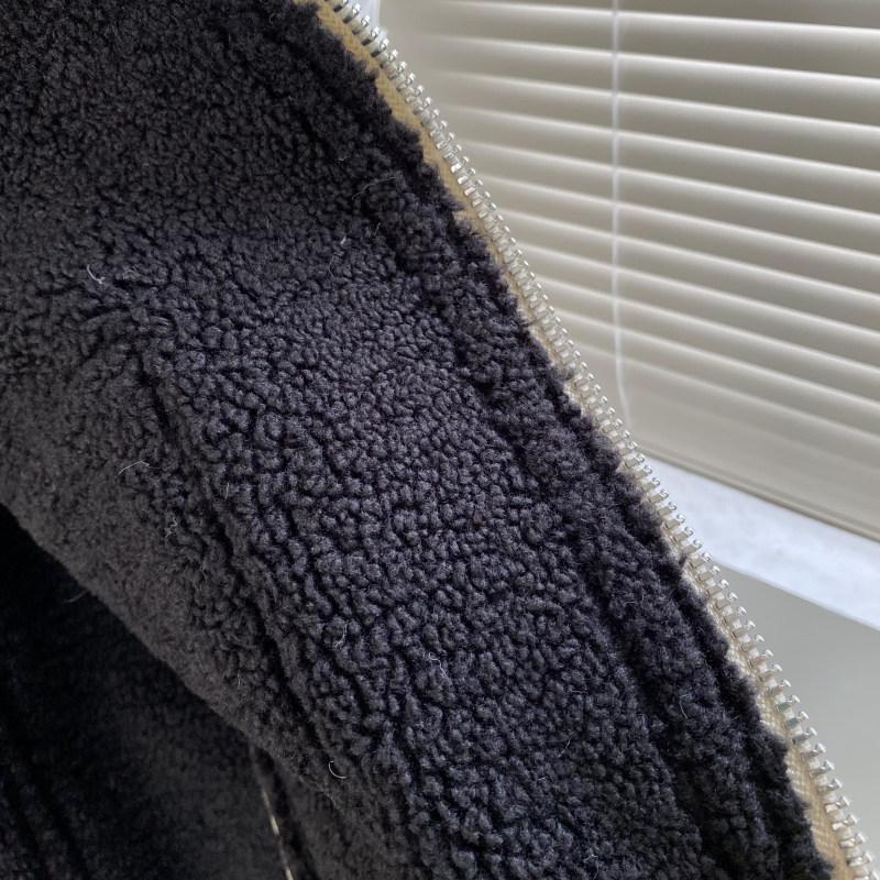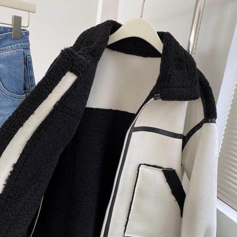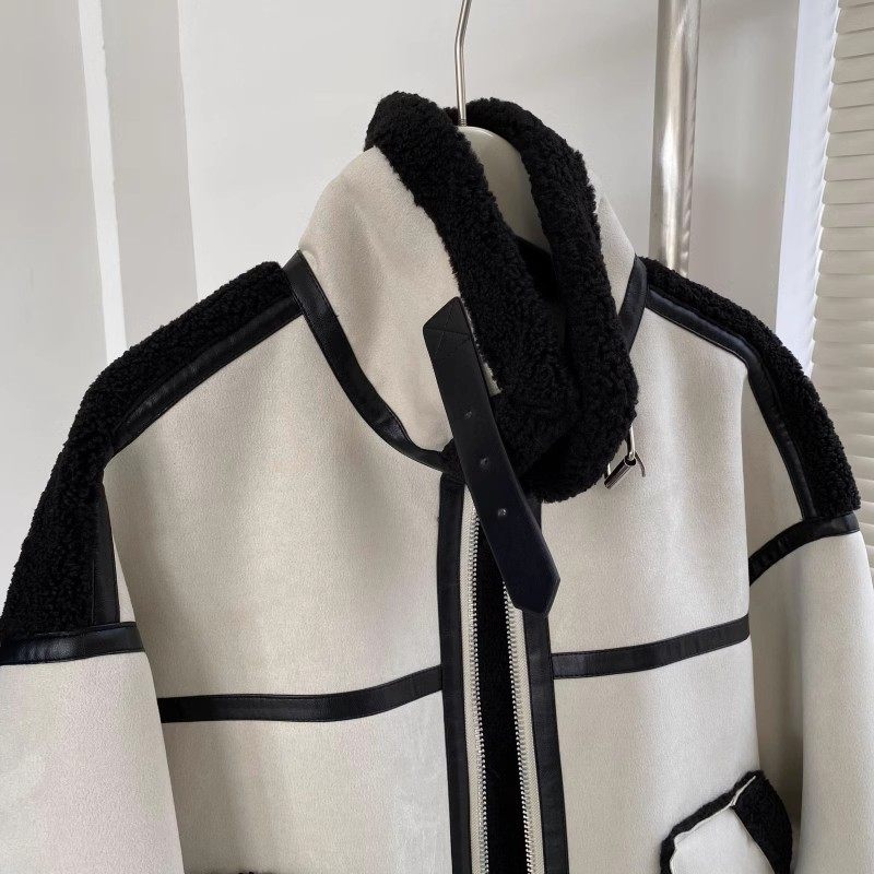 包邮!8068#象牙白机车宽松口袋皮毛一体加厚外套 1.6KG