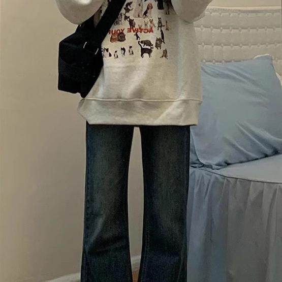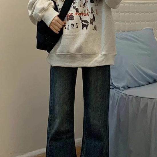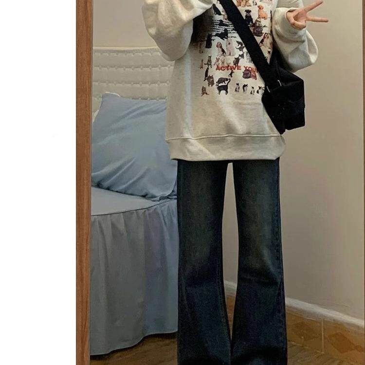 蓝灰色微喇牛仔裤女春秋大码胖mm高腰显瘦宽松梨形身材不贴腿裤子