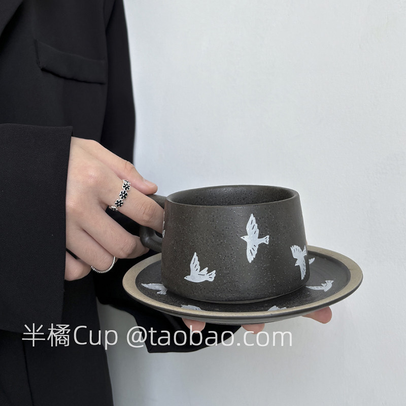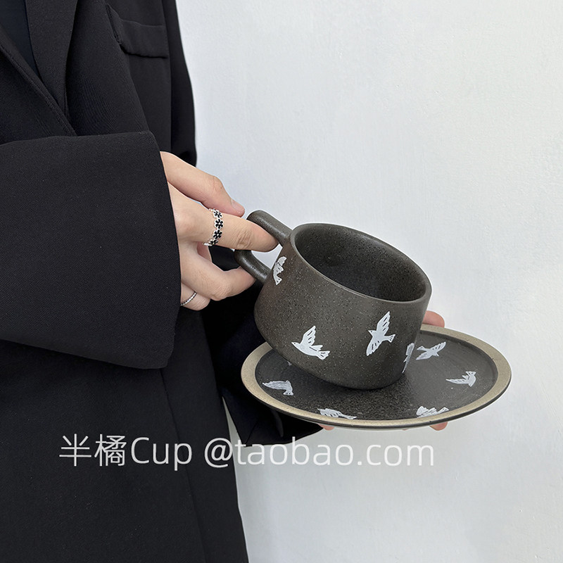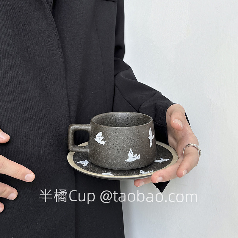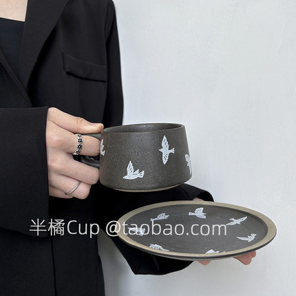 半橘Cup 限定黑咖色自由燕子咖啡杯套装情侣杯拉花杯下午茶水杯