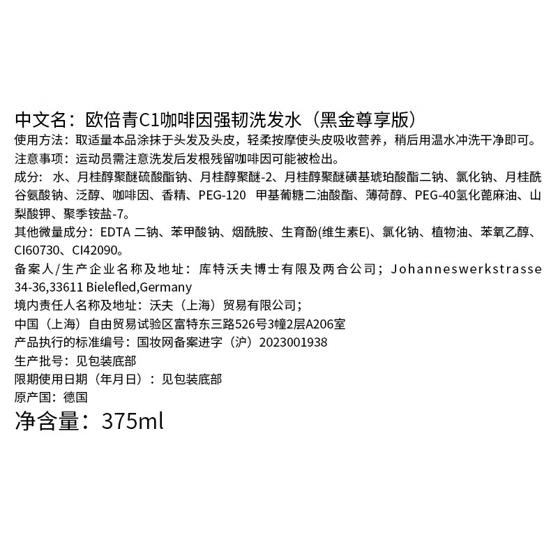 Alpecin欧倍青C1咖啡因强韧洗发水黑金尊享版375ml德国进口