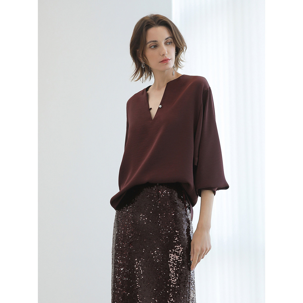 COCOBELLA轻奢高密亮片气质酒红半身裙对丝直筒裙裹身裙HS3121-2
