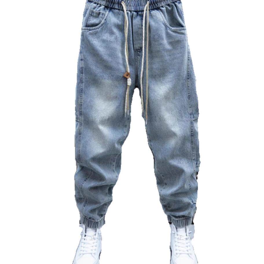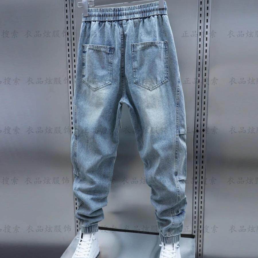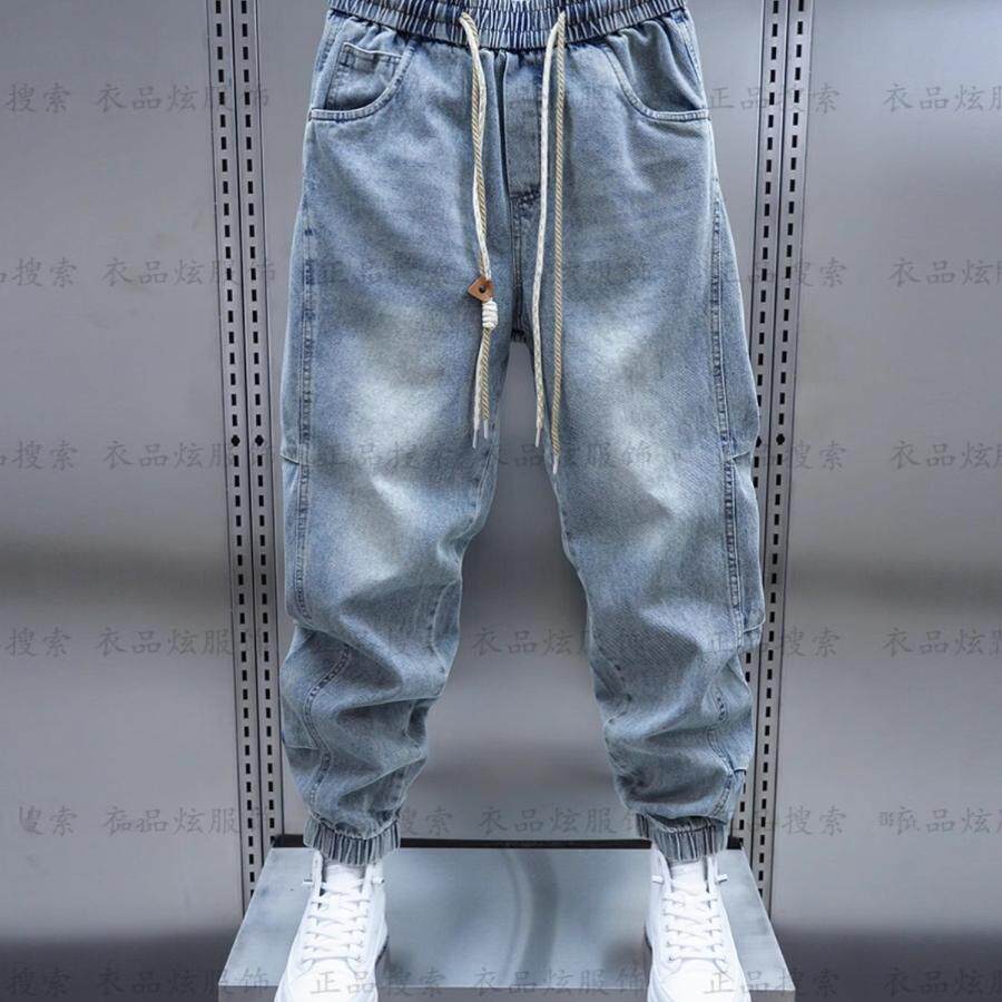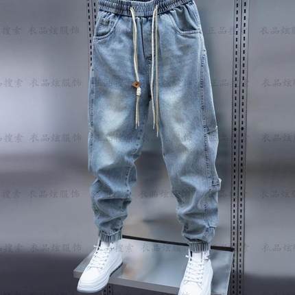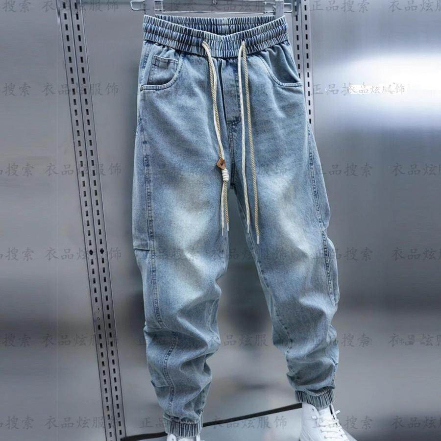 2025潮流男士新款牛仔裤春季浅蓝色束脚哈伦裤松紧腰宽松小脚裤男