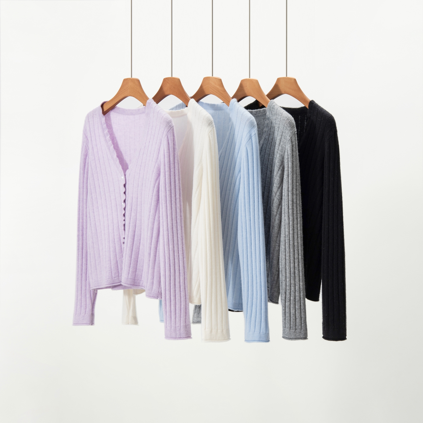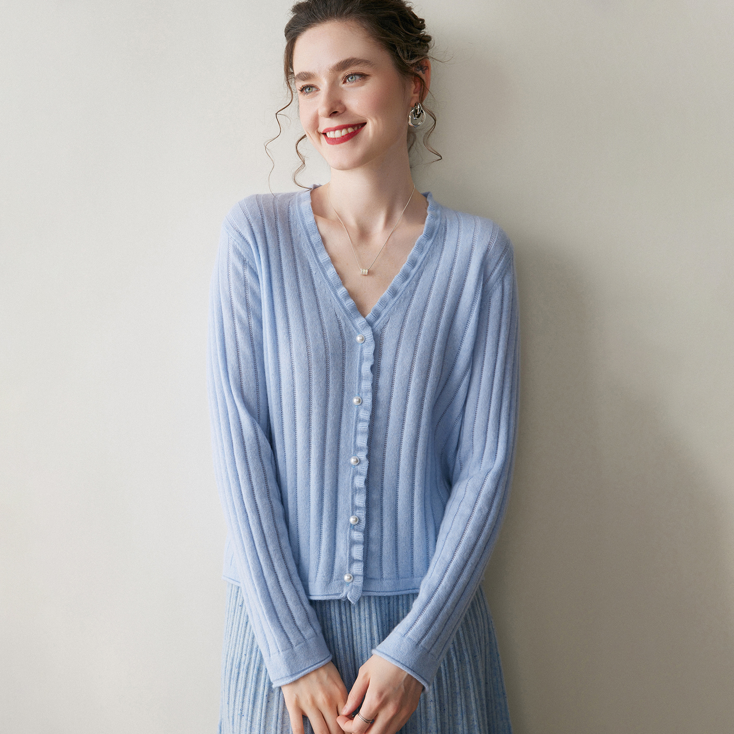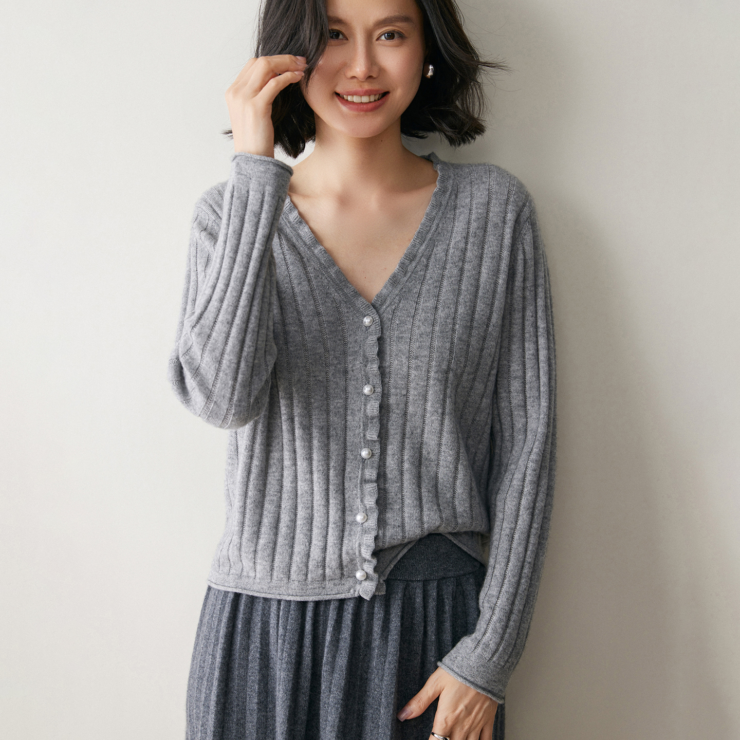 秋冬新款V领波浪花边羊绒针织开衫女宽松显瘦毛衣外套羊毛打底衫