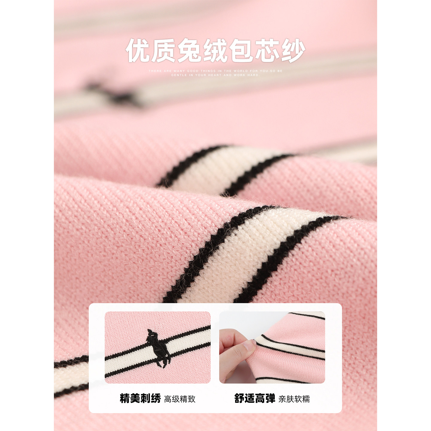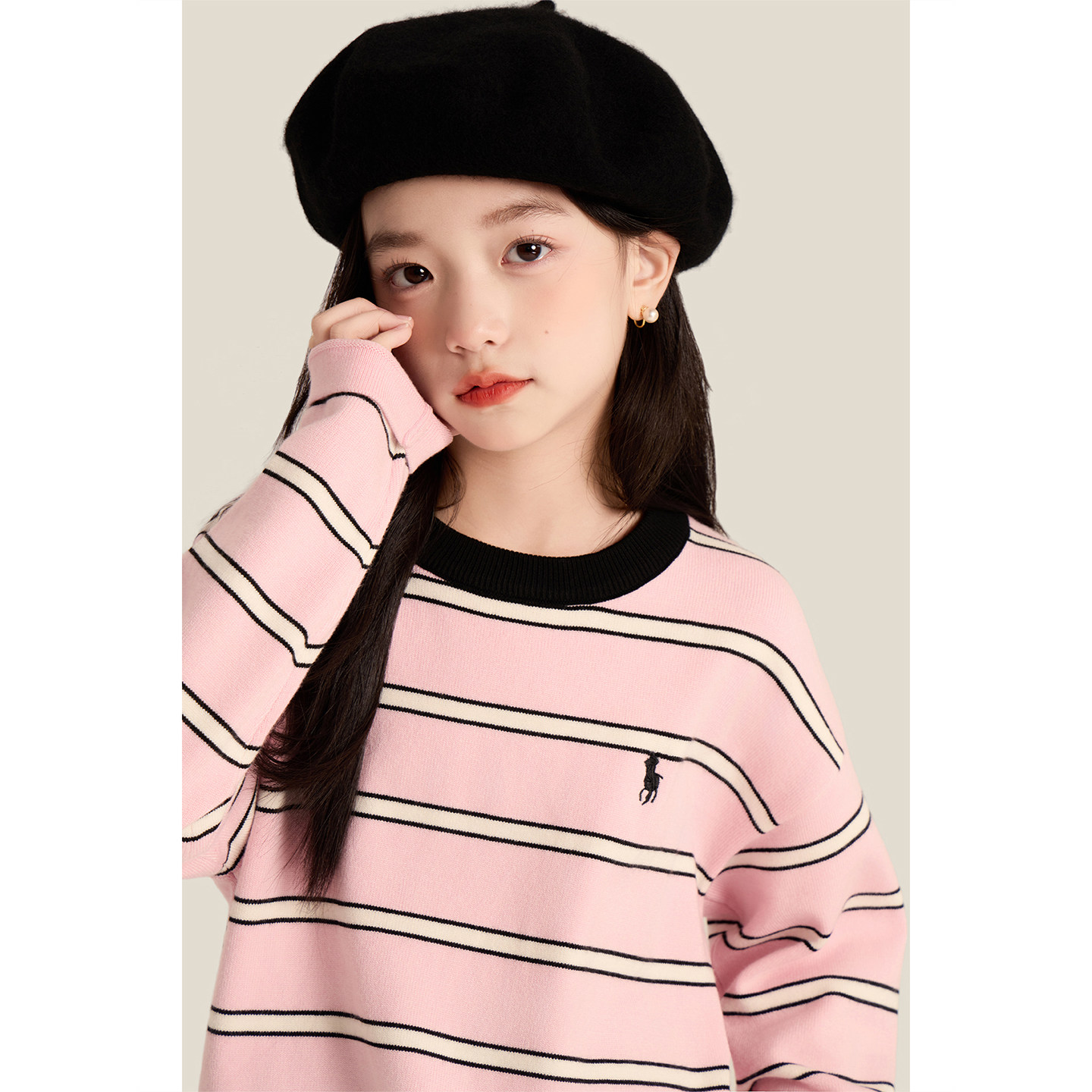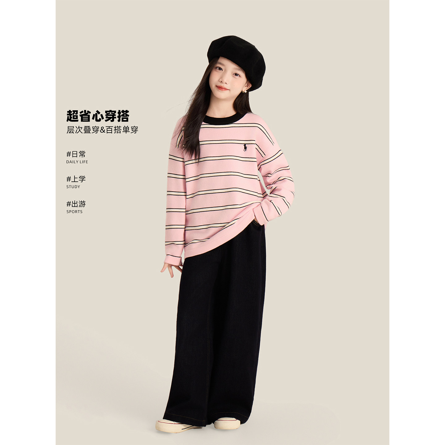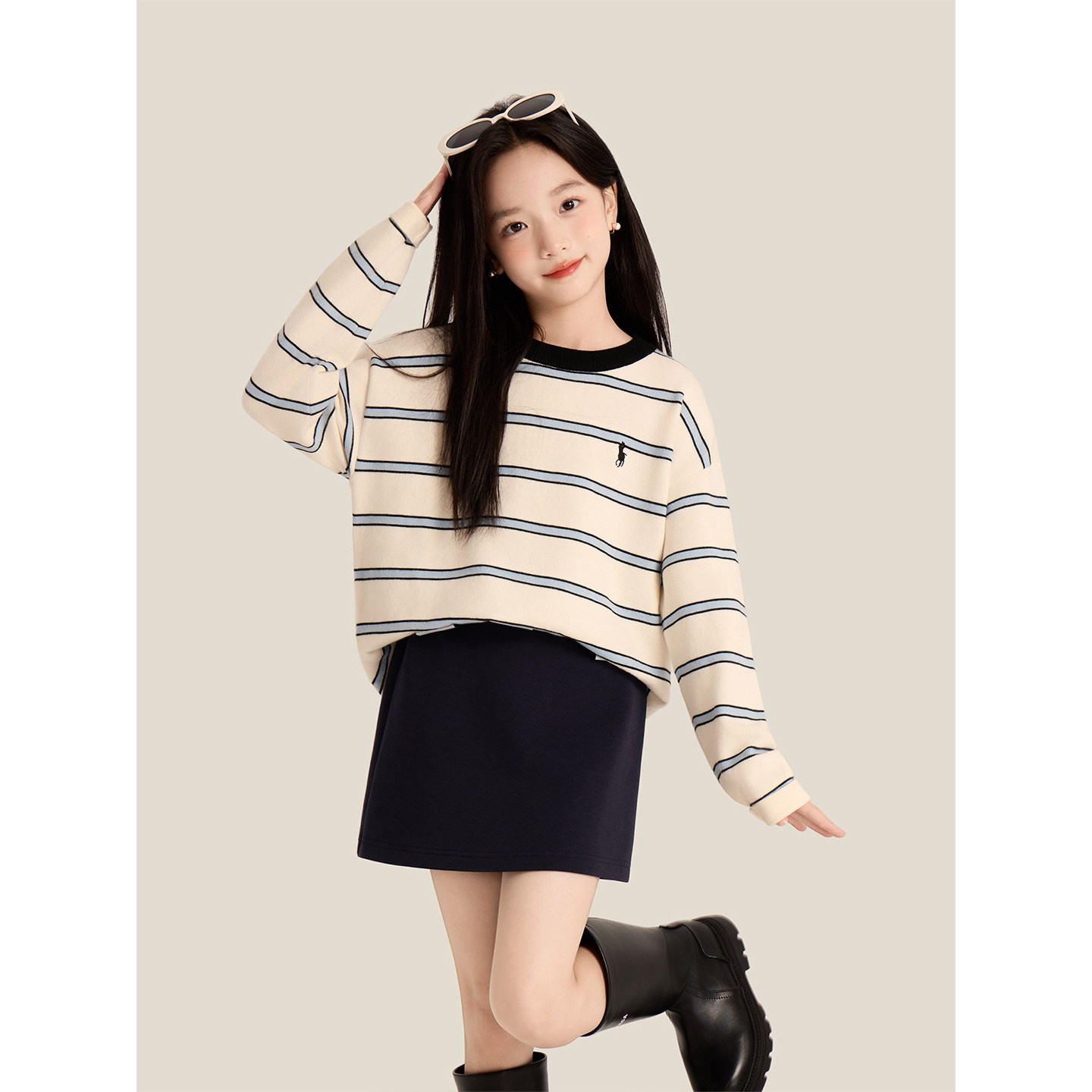 Amybaby女童上衣冬季2025新款韩版时尚撞色条纹刺绣拼接针织衫