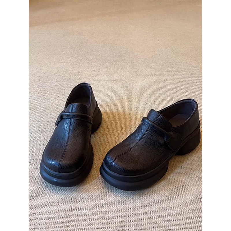 英伦厚底增高圆头魔术贴乐福鞋女2025秋季新款复古黑色小皮鞋单鞋