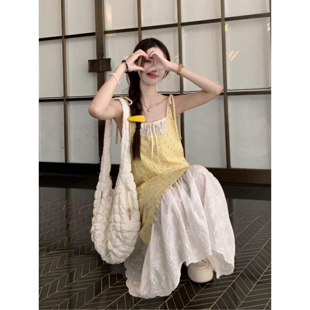 两件拼接清新吊带格纹连衣裙夏季新款韩版宽松设计度假裙子长裙
